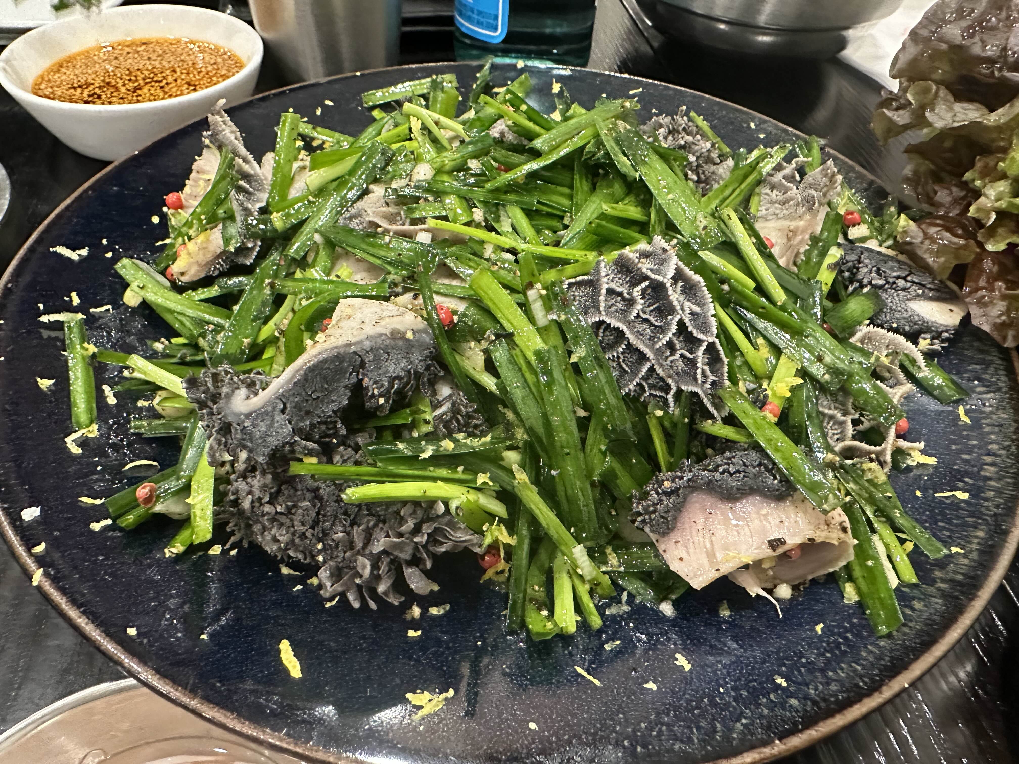 두툼한 양무침이 나왔습니다. 양무침 위로 부츠와 산초와 생강채가 같이 뿌려져 나옵니다. 통통한 양의 식감과 잘 삶아진 정도의 맛이 아주 좋습니다. 특히 부추와 같이 특제 소스에 찍어먹으면 더 맛이 좋습니다. 고수를 좋아하시는 분들은 고수와 같이 드시던데 저는 고수를 먹지 못해 아쉽습니다.