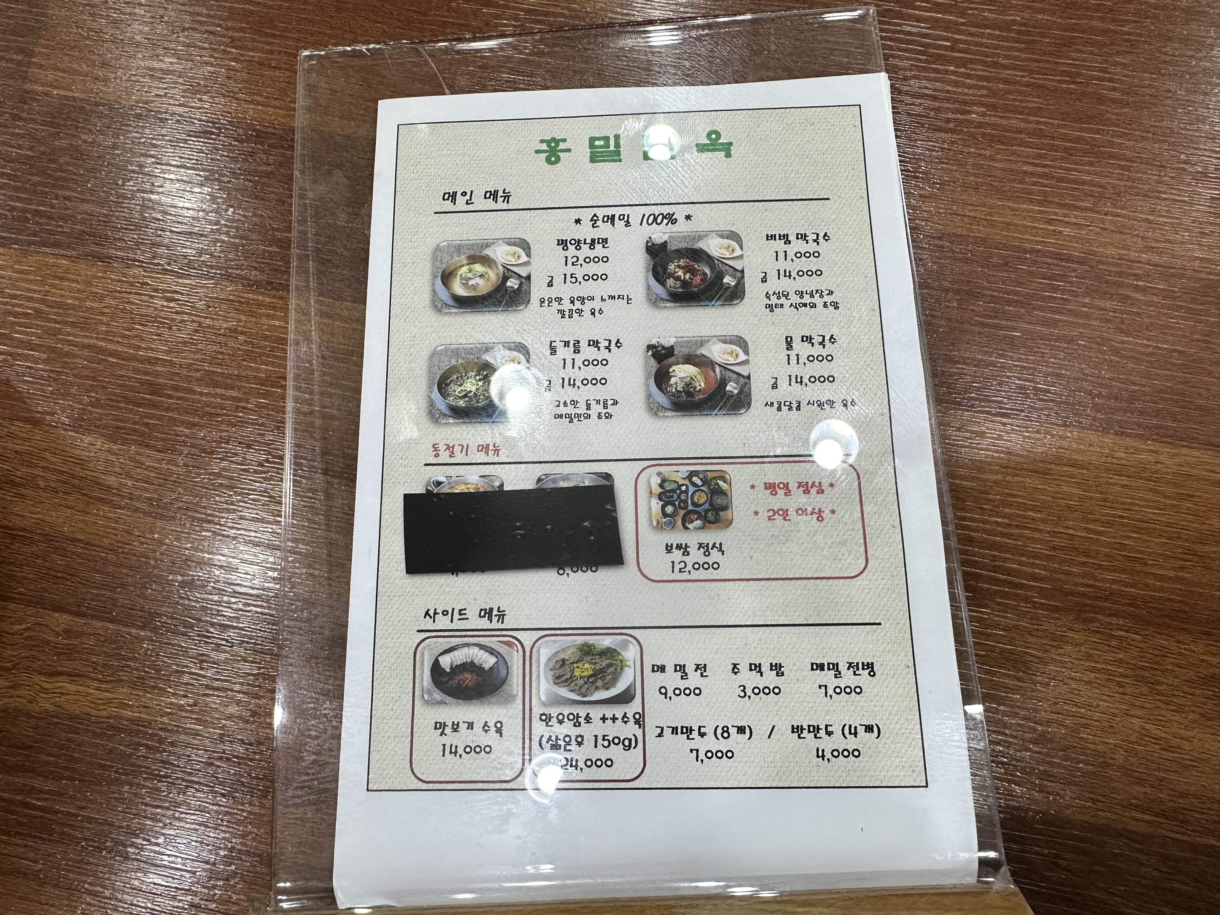 평양냉면과 비빔막국수, 들기름 막국수와 새콤달콤한 물막국수가 대표 메인 메뉴입니다. 또한 사이드로 돼지수육과 소 수육, 메밀전, 만두 등 다양한 메뉴가 있습니다.