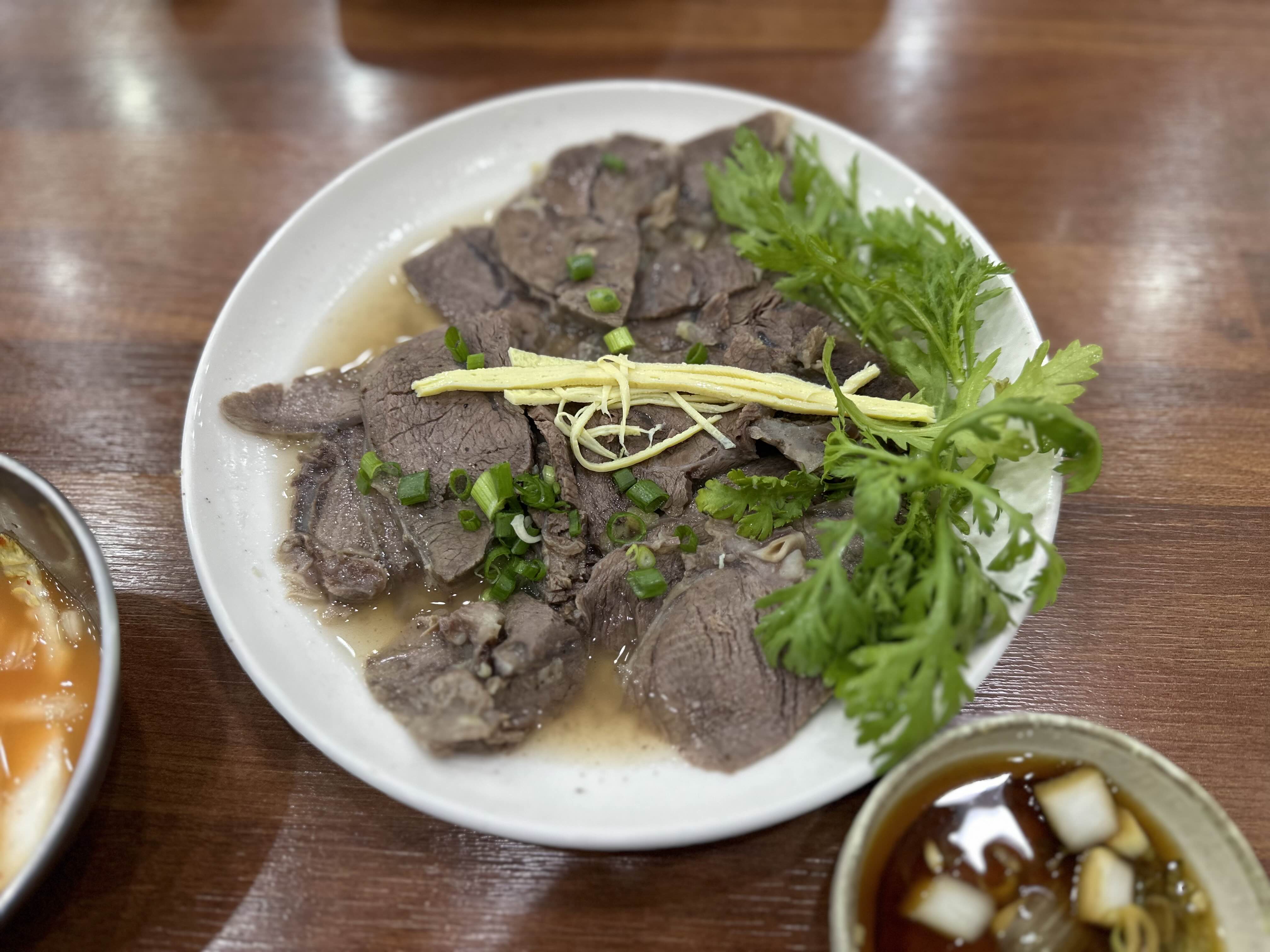 한우 사태와 아롱사태로 보이는 수육이 나왔습니다. 딱 적당히 삶아져 부드럽고 따뜻한 수육입니다. 투쁠이라서그런지 육향도 장난아닙니다. 수육 밑에 깔린 국물도 후추향이 살짝 나면서 정말 맛있습니다. 곰탕을 팔아도 좋을듯합니다.