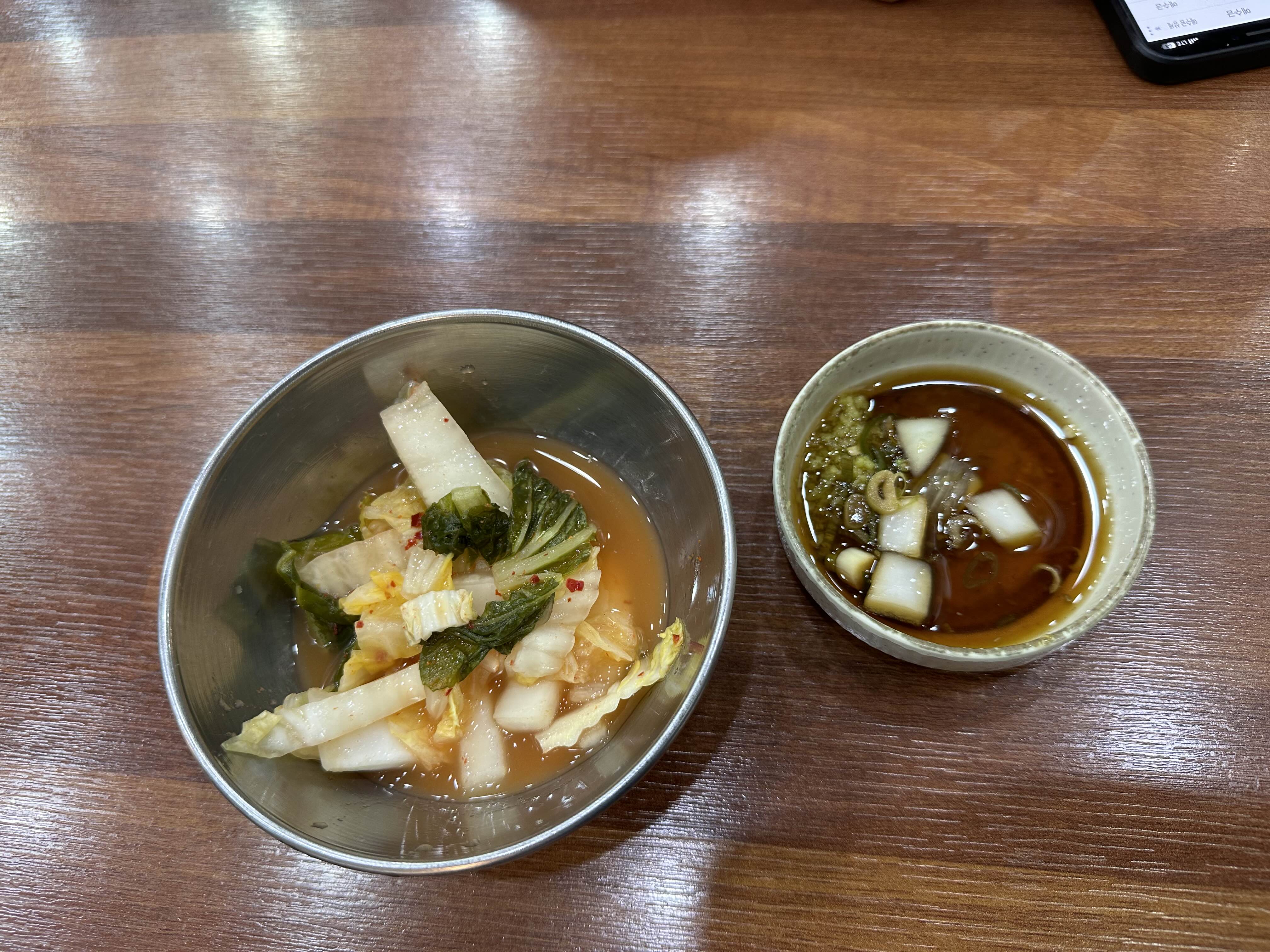 기본찬으로는 슴슴한 물김치가 나오고 한우 암소 투쁠 수육을 주문해서 수육에 찍어먹을 새콤한 소스가 나왔습니다. 물김치를 맛있게 먹고 있으니 가득 리필해 주셨습니다. 눈썰미가 참 좋으신듯 합니다.
