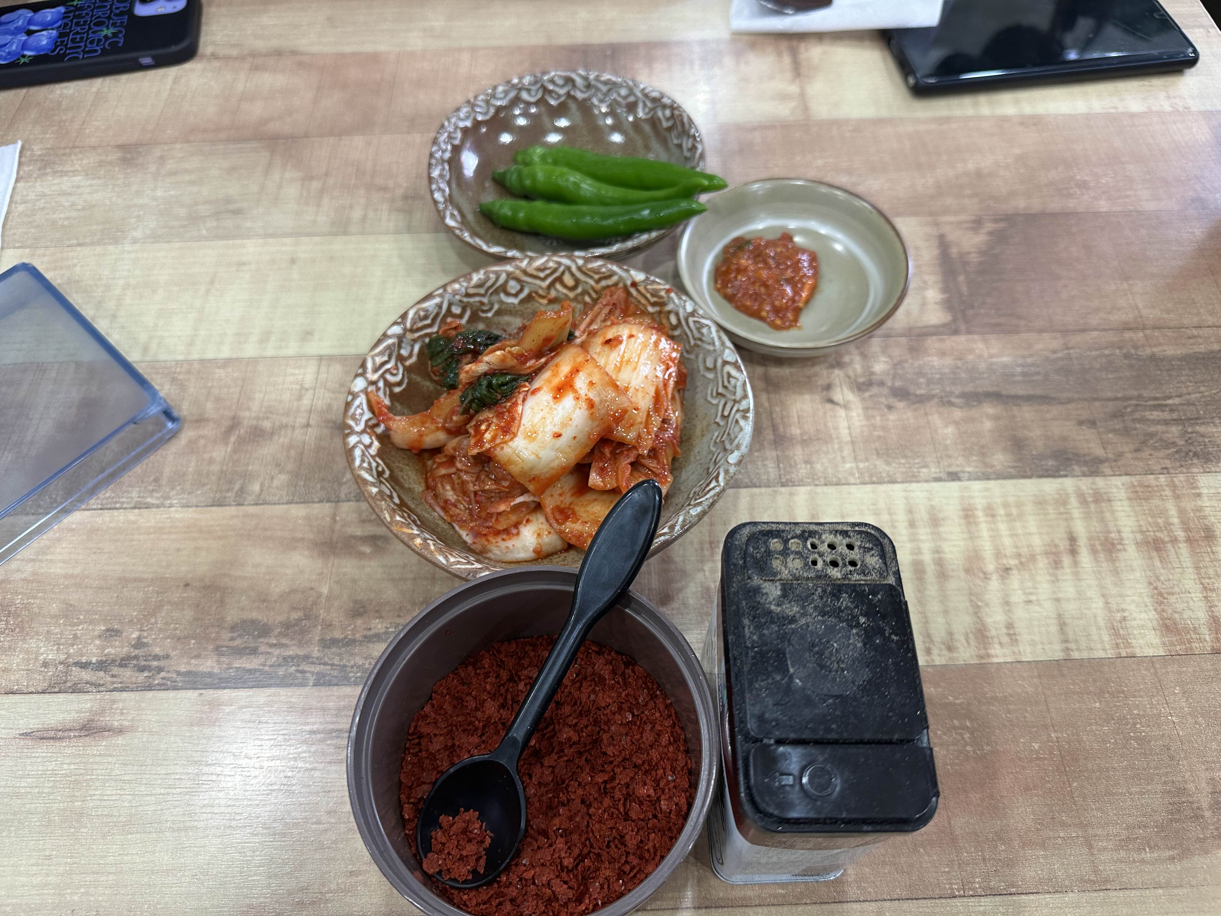 밑반찬은 배추김치와 고추만 나옵니다. 배추김치가 맛이 좋아서 두번 리필해 먹었습니다. 리필은 셀프가 아니고 종업원에게 달라고 하면 됩니다.