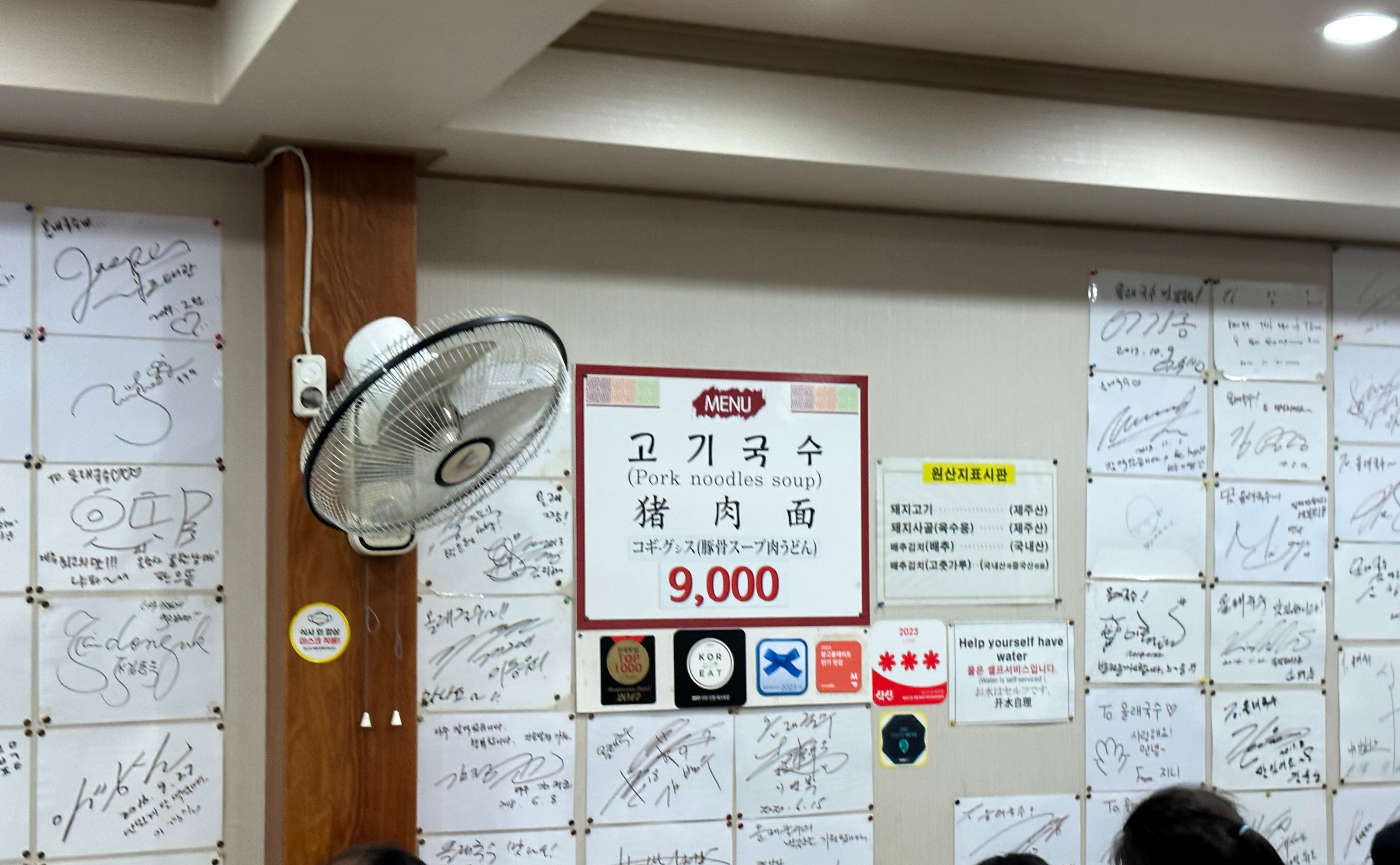 메뉴는 단일메뉴로 고기국수만 판매합니다. 물가가 많이 오르긴 오른게 저렴했던 고기국수가 어느순간 9천원이 되었습니다. 요즘은 9천원이어도 먹을만하다고 느끼는 가격... 블루리본 서베이도 받았고 여러 유명인 사인도 많은 올래국수 본점입니다.