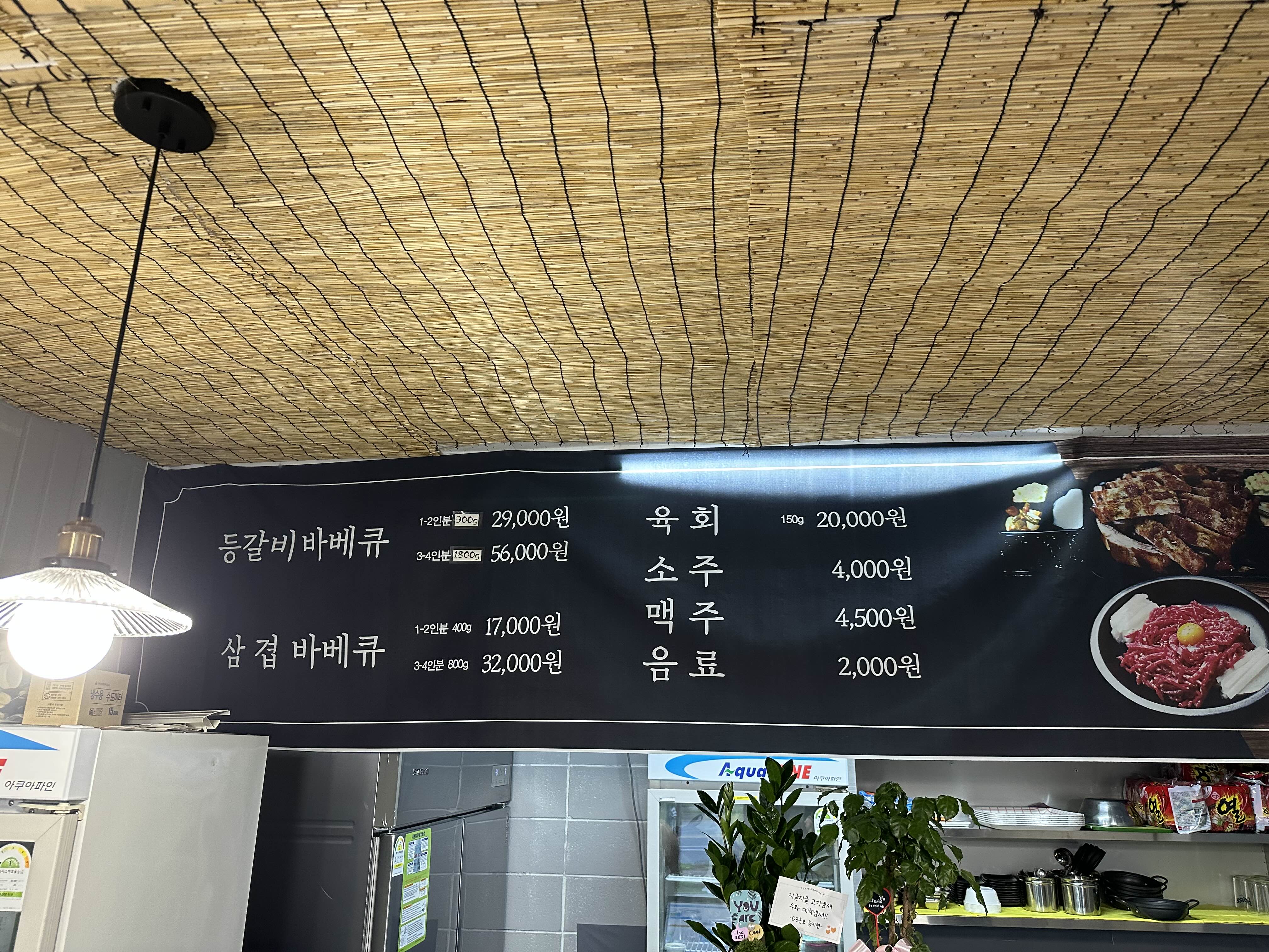 메뉴는 심플한편으로 등갈비바베큐와 삼겹바베큐가 메인이고 육회도 있습니다. 육회는 수요일에 소를 잡아 수요일부터 가능하다고 합니다. 바베큐는 400g 단위인데 200g씩 추가하면 좋을 것 같습니다. 삼겹바베큐 400g을 주문했습니다.