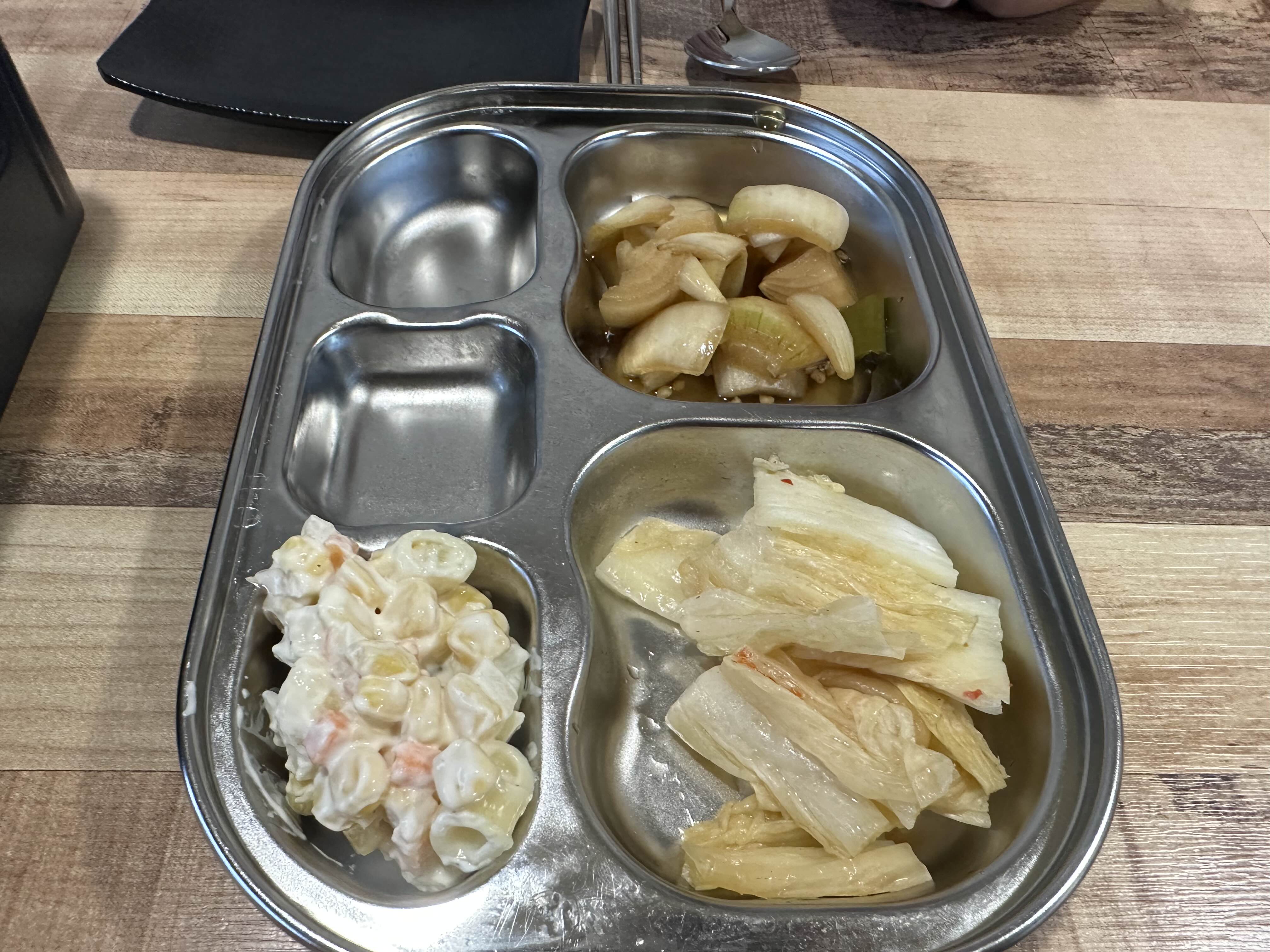 양파와 고추장아찌, 백김치, 마카로니가 기본찬으로 나옵니다. 바베큐가 나오기 전에 마카로니와 한잔 하고 있으면 바베큐가 나옵니다. 장아찌와 백김치는 바베큐를 먹다보면 살짝 느끼해질 때 먹으면 깔끔하게 맛을 잡아줍니다.