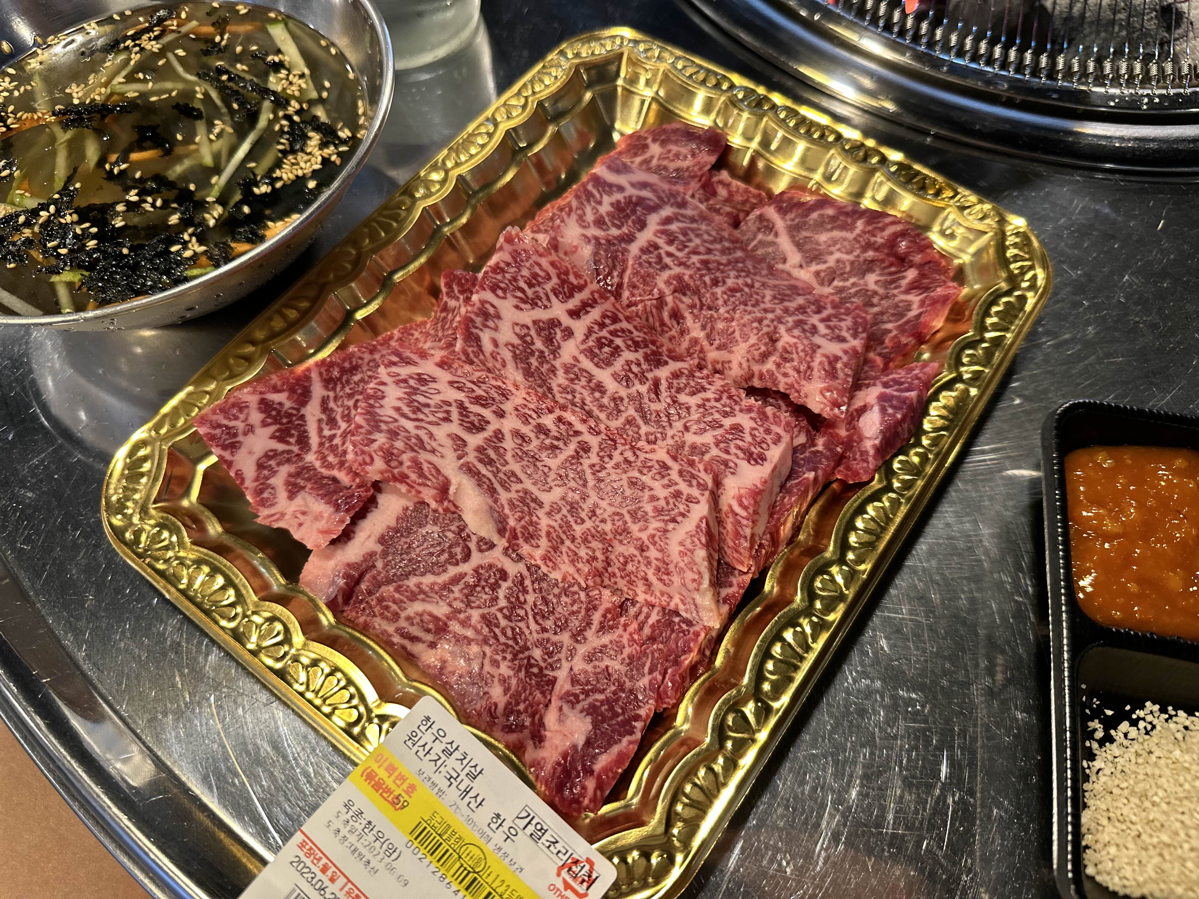 살치살은 1++(8)라고합니다. 1++(9)에 이어 두번째로 마블링이 좋은 1++(8)이니 기대가 많이 되었습니다. 보이는 비쥬얼은 아주 마블링이 좋았습니다.
