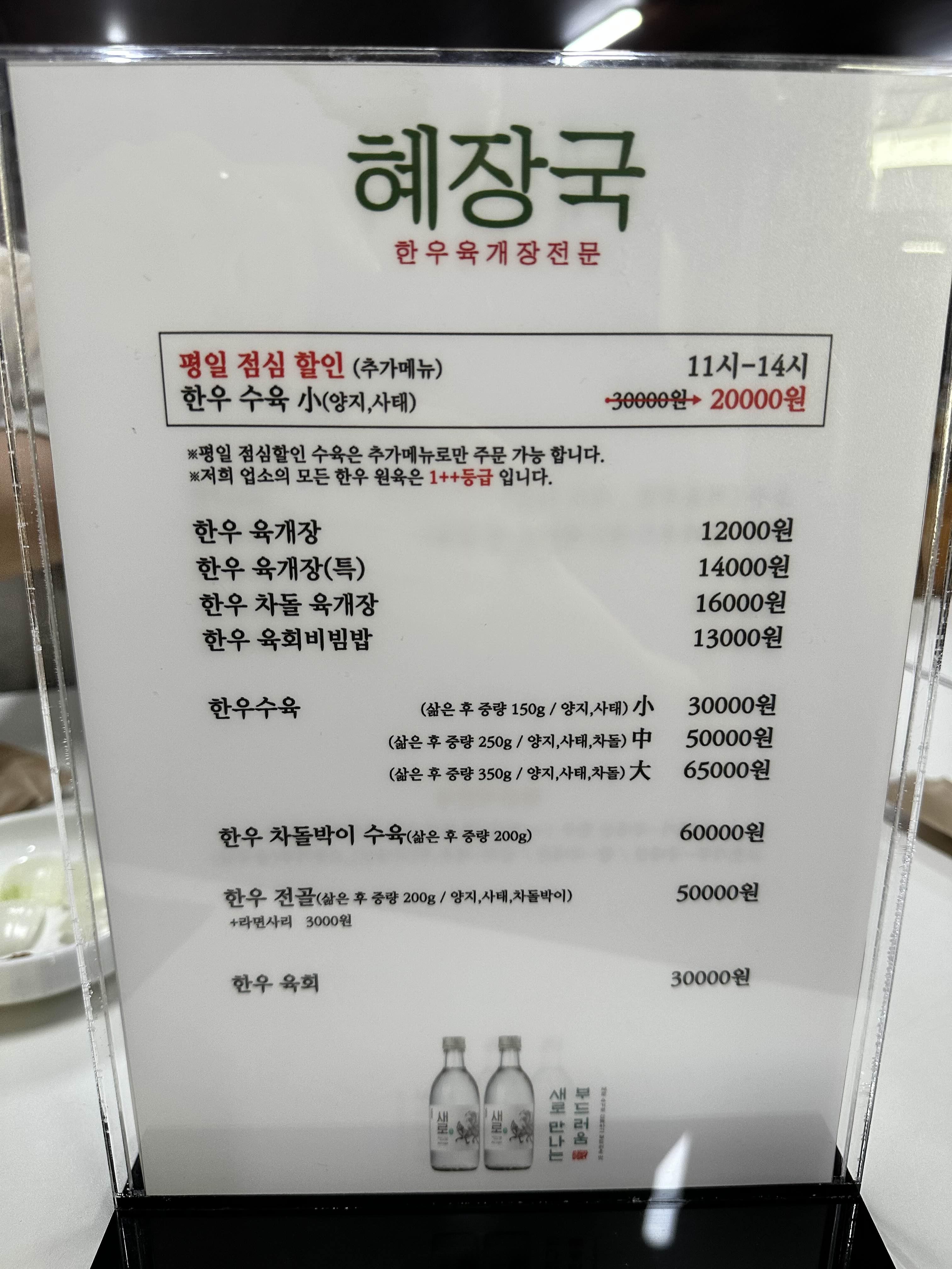 대표메뉴는 한유육개장이고 수육과 전골, 육회도 판매합니다. 평일 점심에 수육을 사이드메뉴로 주문하면 할인이 들어갑니다. 한우차돌육개장과 중짜리부터 차돌박이가 들어가는 수육 중짜리, 한우 육회를 골고루 주문하였습니다. 주류는 일품진로 가격이 괜찮습니다.