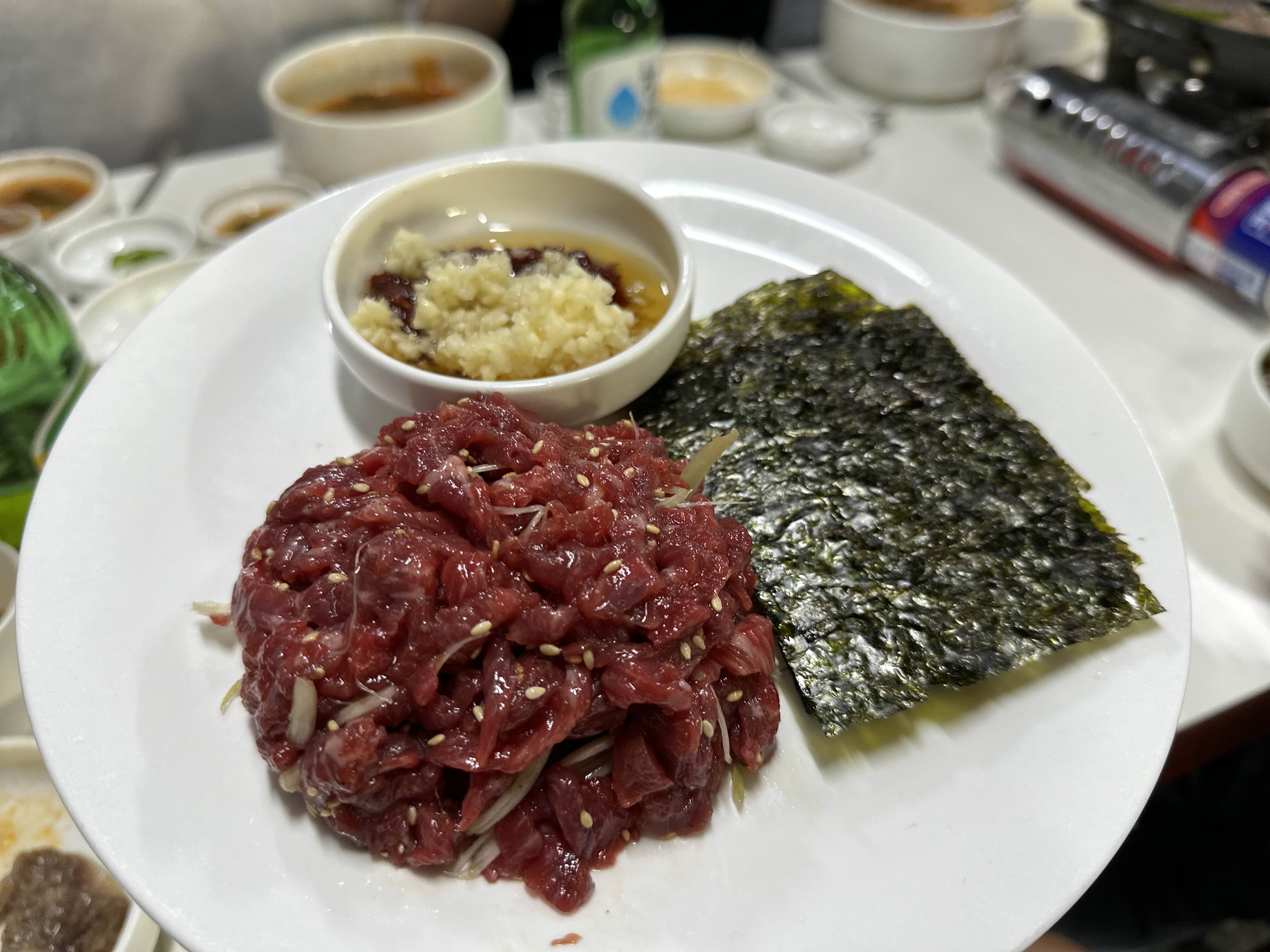 한우 1++ 육회는 정말 신선한 비쥬얼을 자랑합니다. 기름장에 다진마늘을 풀어 김과 싸먹으면 맛이 아주 좋습니다. 식감과 육향이 매우 좋습니다. 소주안주로 정말 좋습니다.