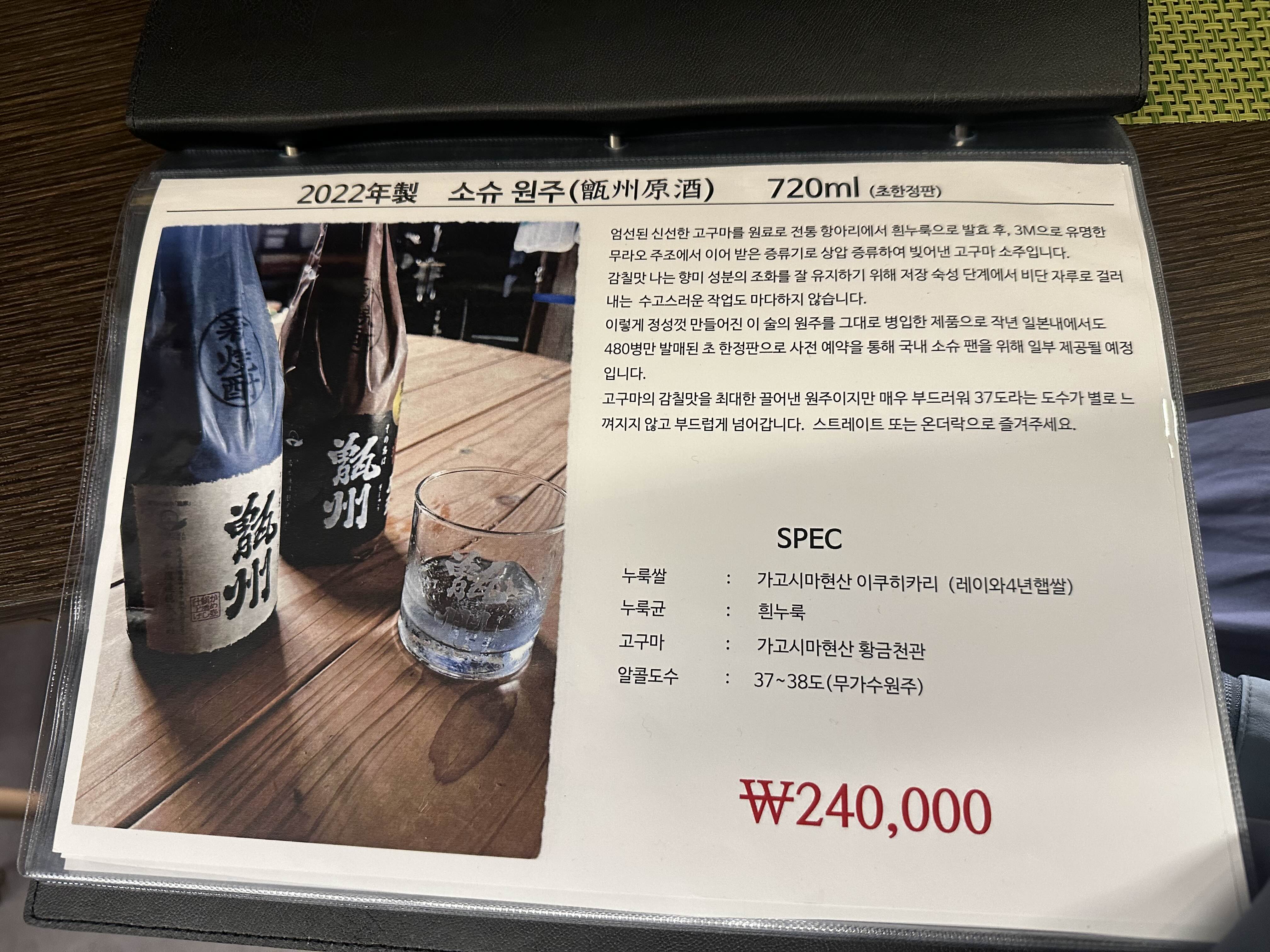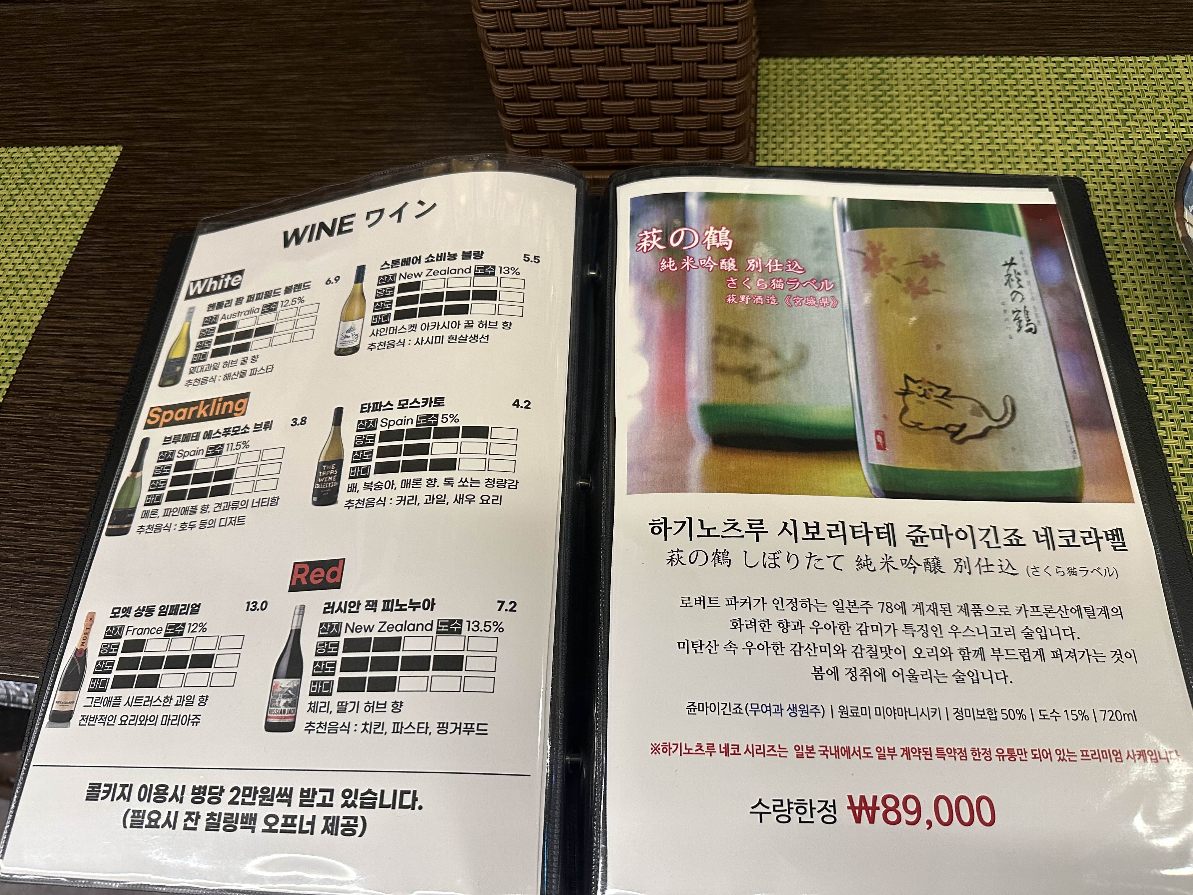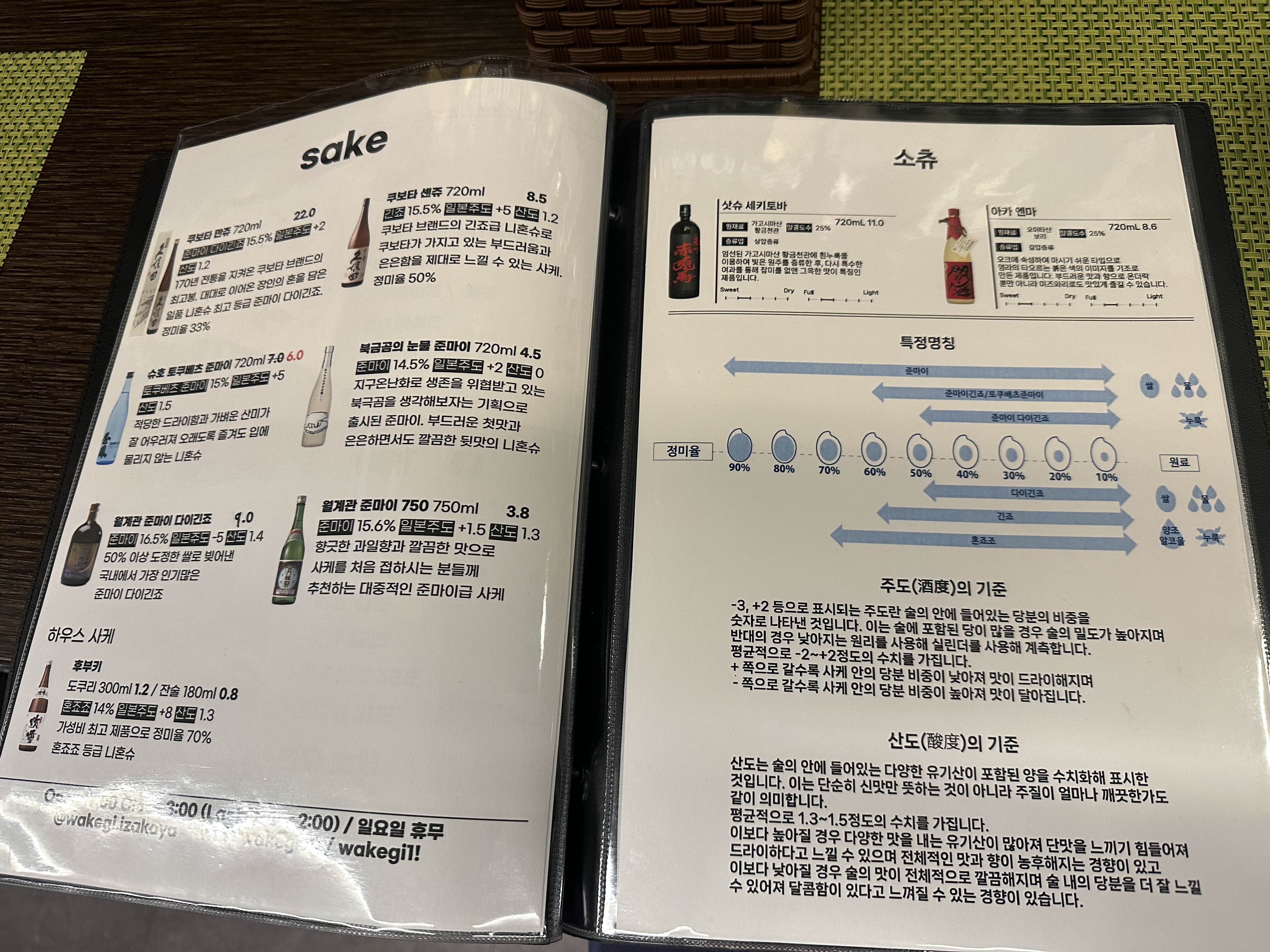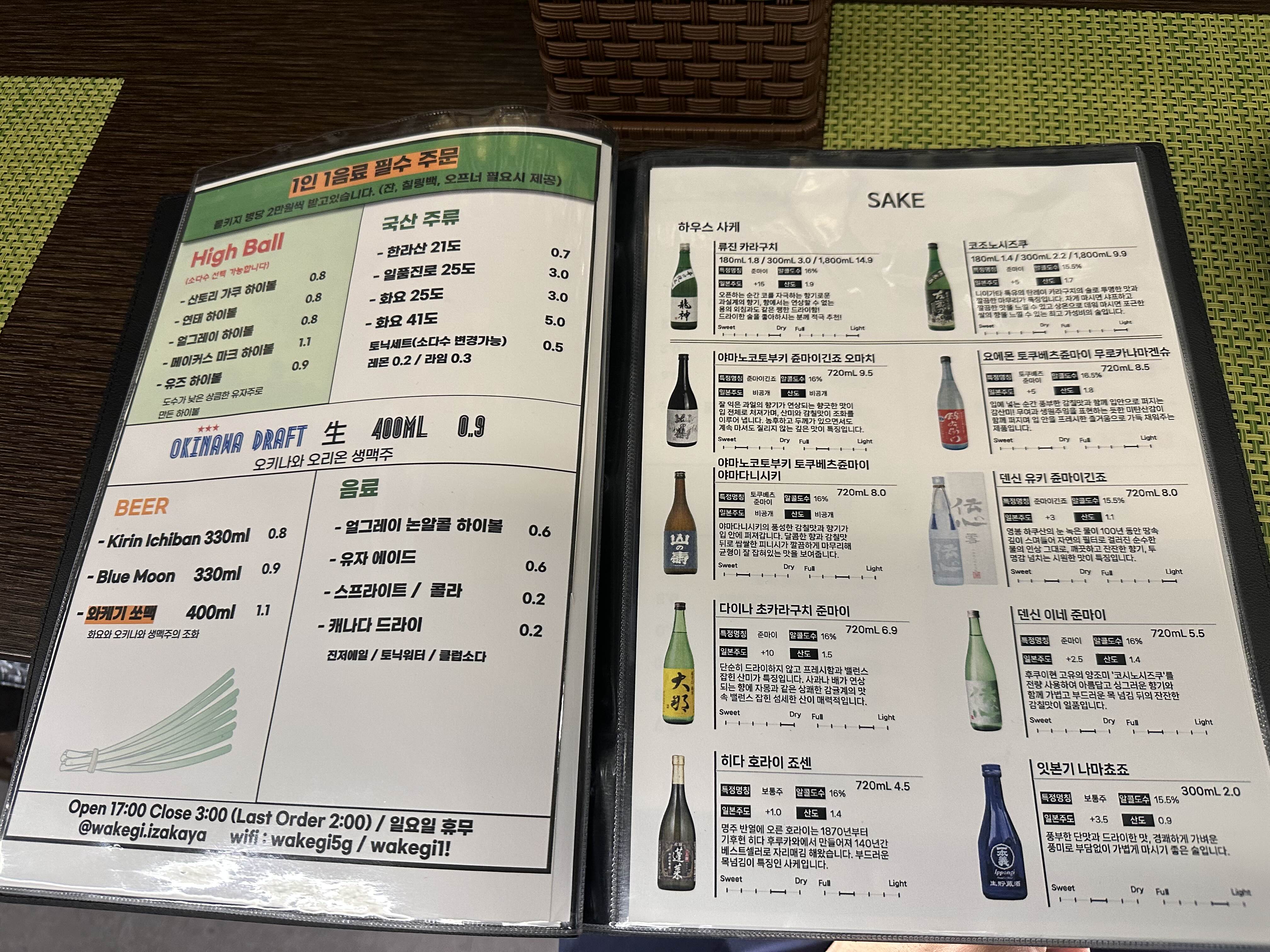 다양한 메뉴와 함께 다양한 일본식 주류를 판매하고 있습니다. 차돌박이 미소야끼와 와케기의 두번째 시그니처메뉴인 와케기의 이름을 걸고 하는 와케기 파스타를 주문했습니다. 주류는 저는 얼그레이 하이볼을 동행인은 산토리 가쿠 하이볼을 주문했습니다.