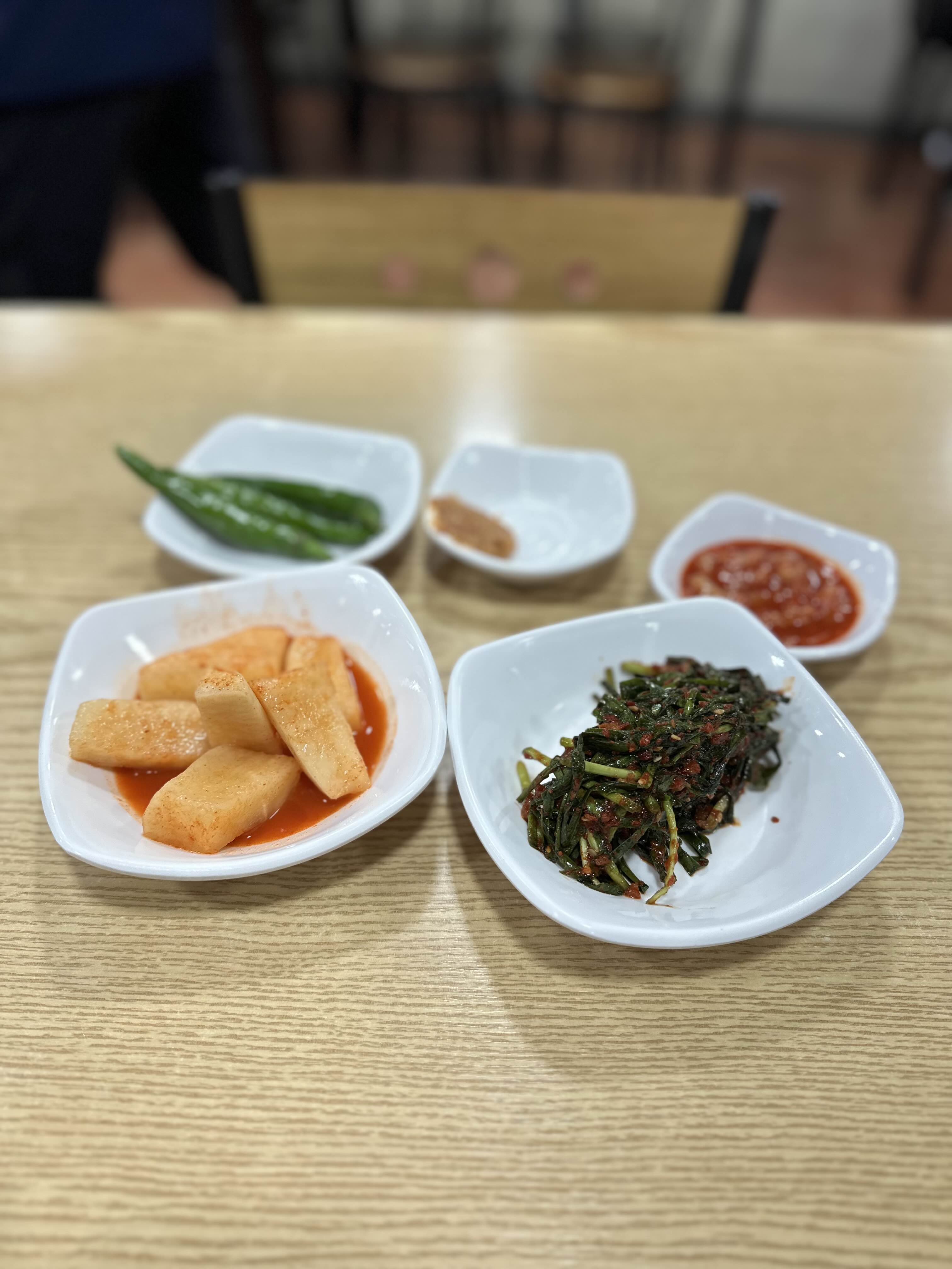 섞박지, 부추, 오징어젓갈, 고추와 된장 기본찬입니다. 섞박지는 시원한 맛에 식감도 단단하고 부추도 간이 세지 않아 밥과 같이 먹기 좋았습니다. 오징어젓갈은 따로 판매도 하는데 맛도 자극적이지 않고 부드러운 맛이 좋았습니다.