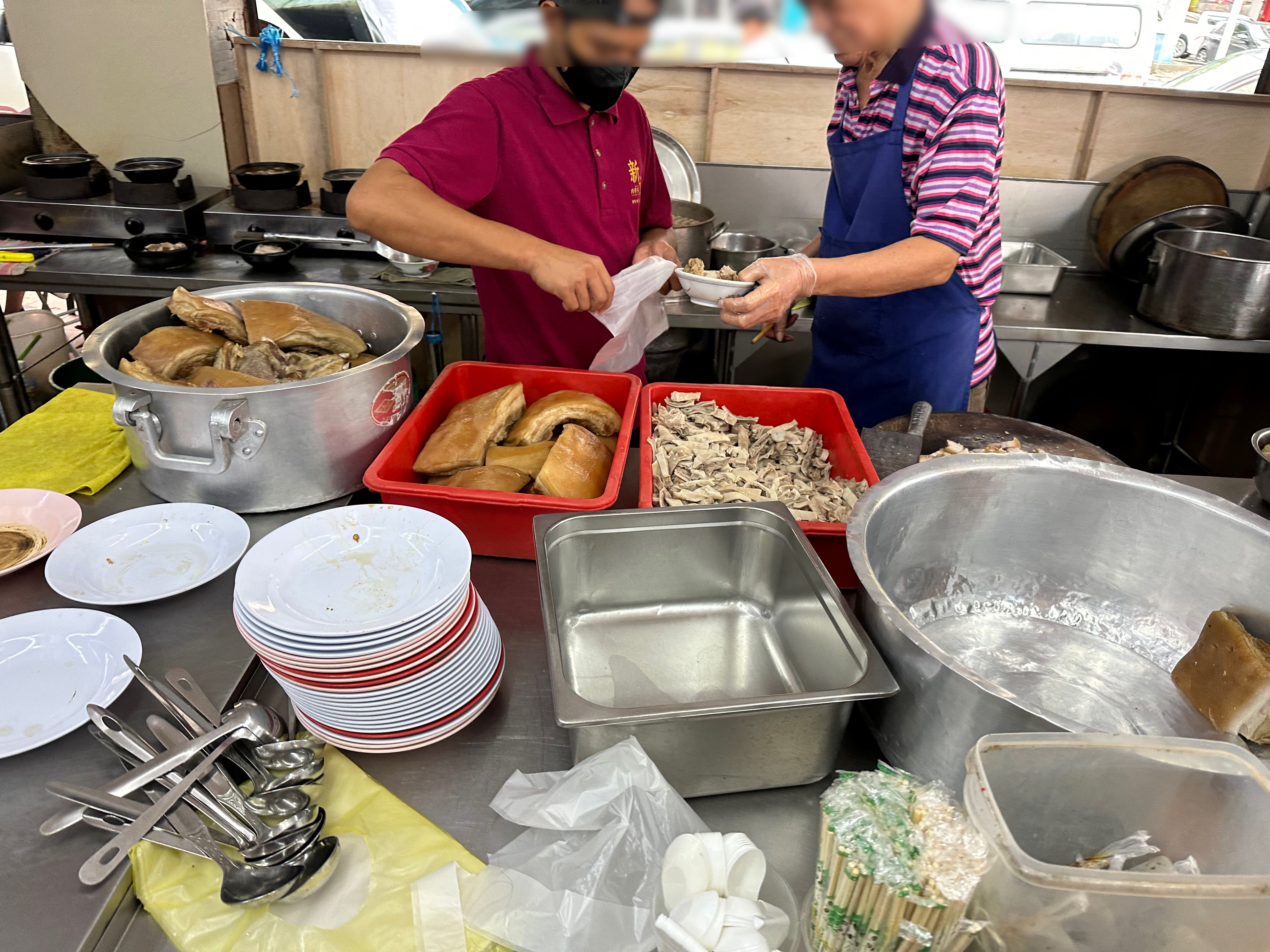 완전 오픈형 주방입니다. 한쪽에선 삶아진 갈비와 삼겹살, 돼지내장을 분리하여 준비하고 한쪽에선 큰 육수통에서 육수를 소분하고 졸이는 등 조리를 합니다.