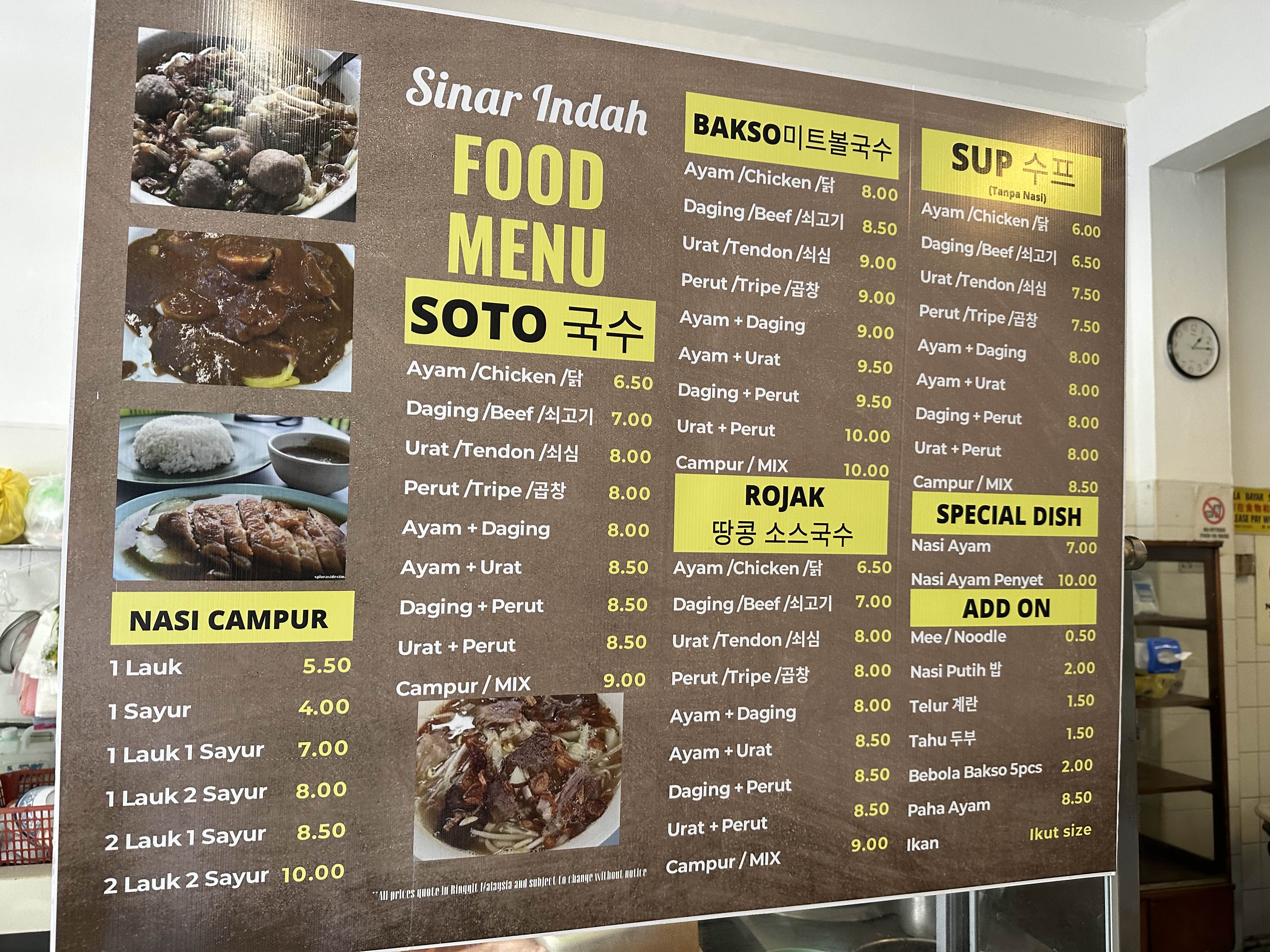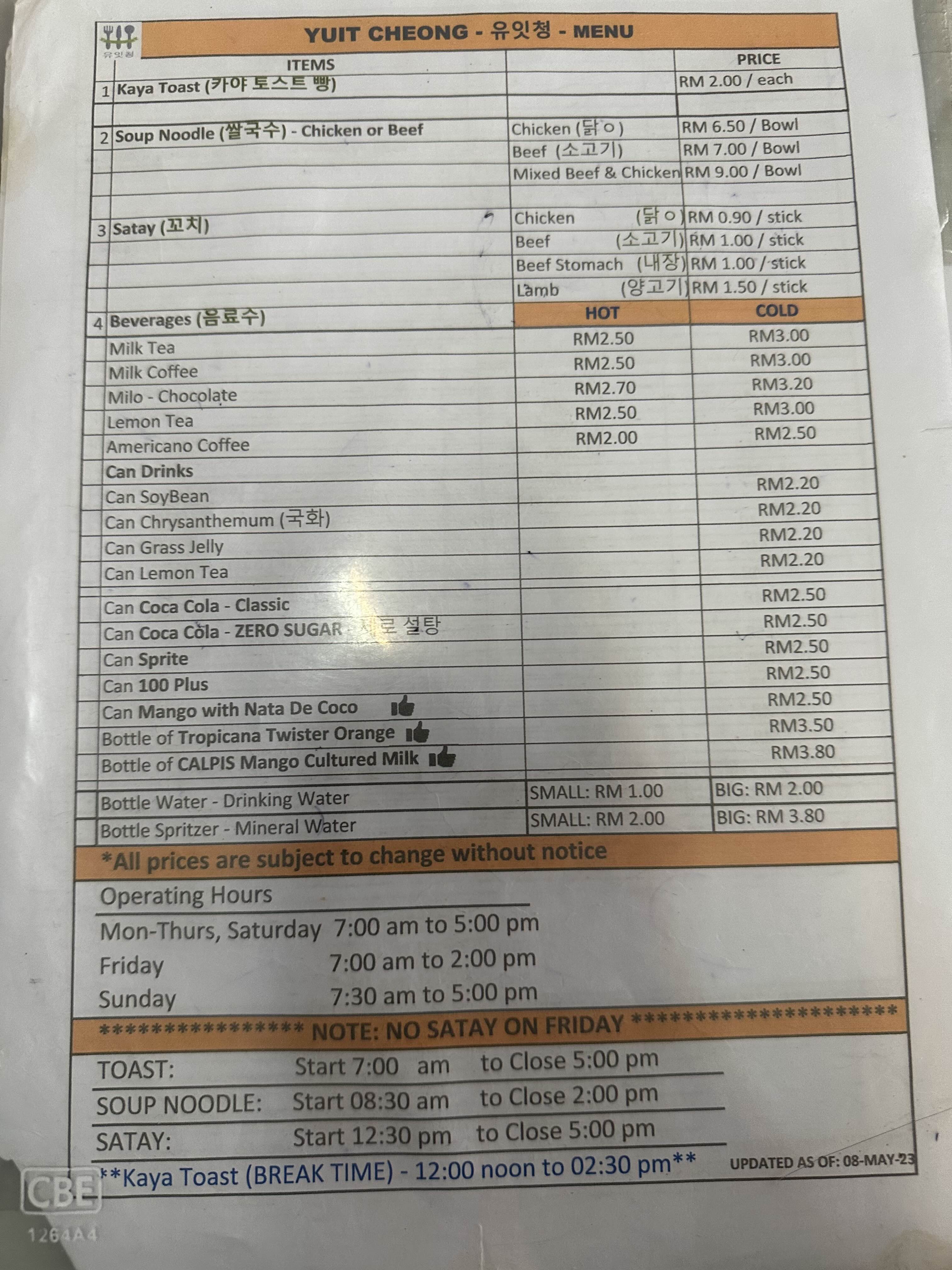 자리에 앉으면 한국말을 매우 잘하시는 사장님이 메뉴판을 가져다주십니다. 카야토스트, 쌀국수, 사테의 가격이 매우 저렴합니다.