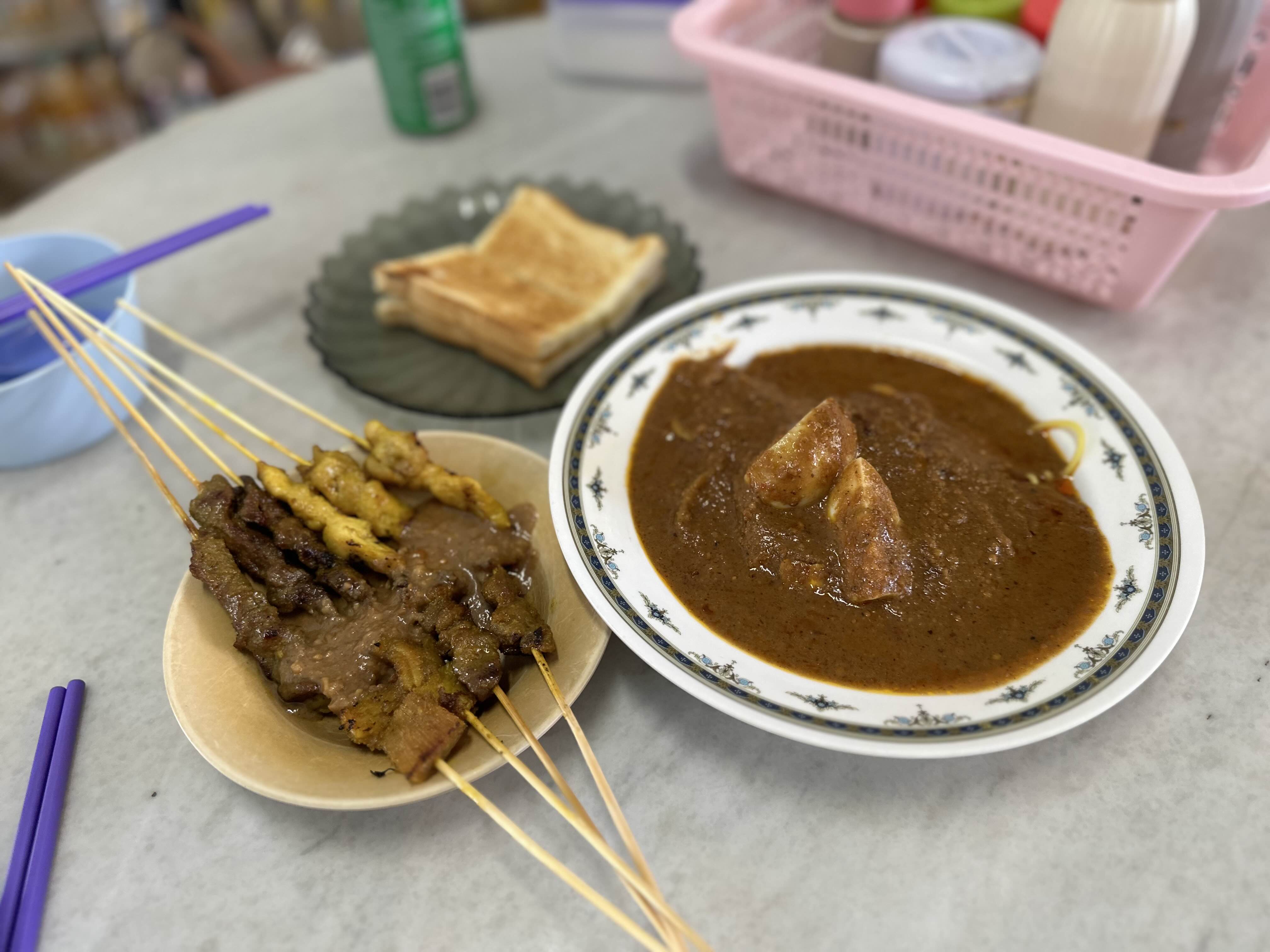 먼저 주문한 카야토스트와 사테, 쇠고기 로작 (땅콩소스국수)이 나왔습니다.