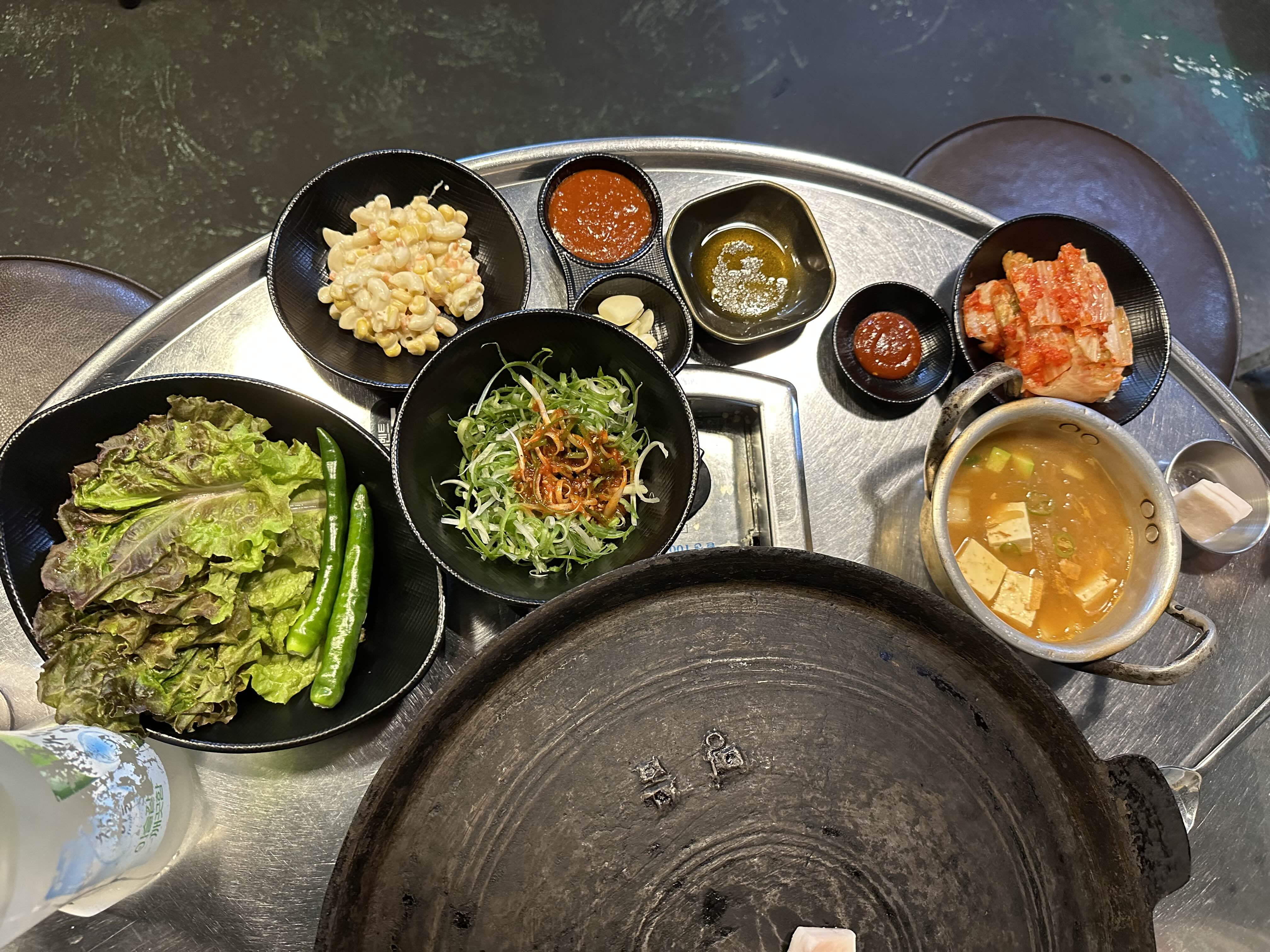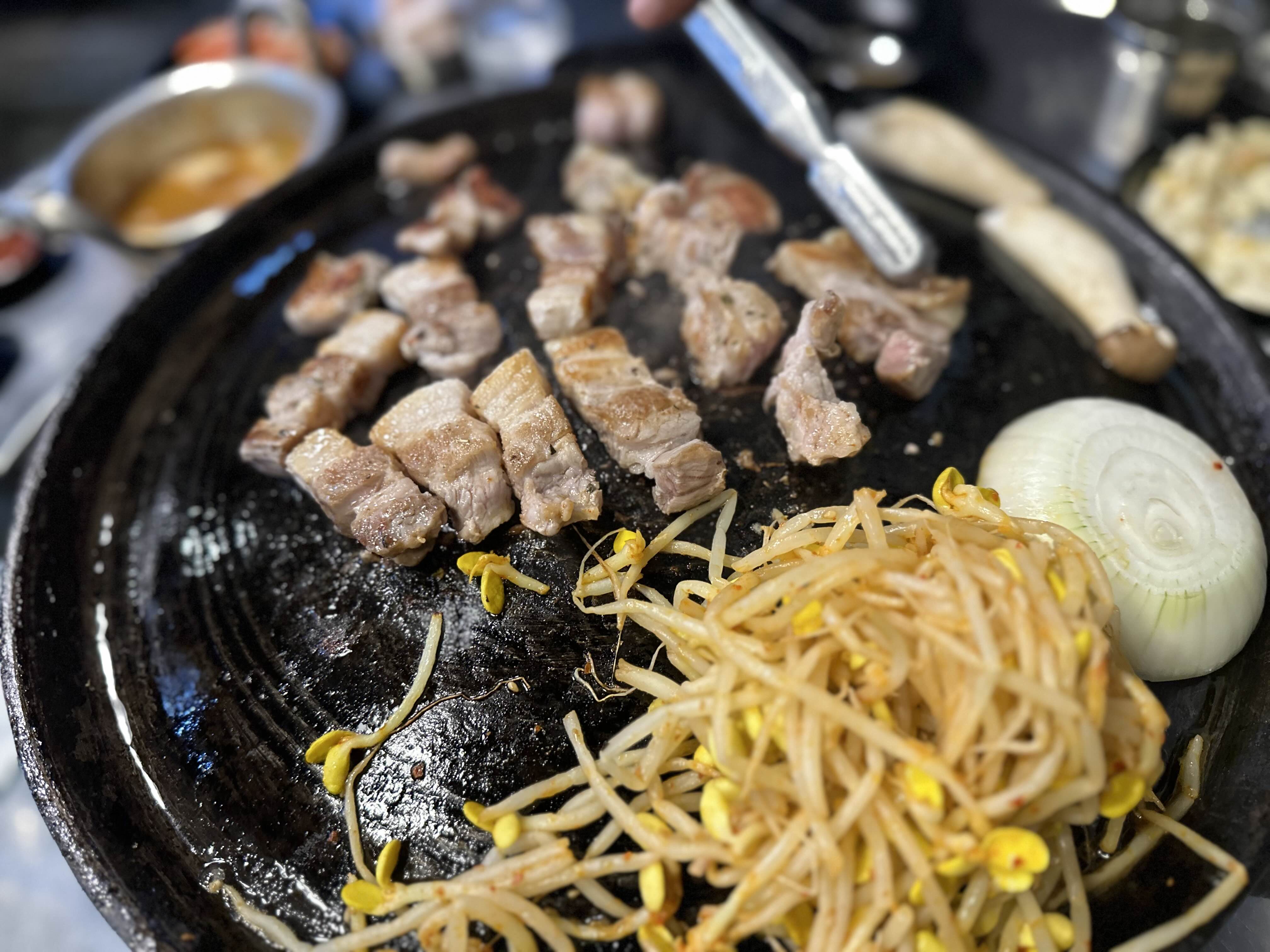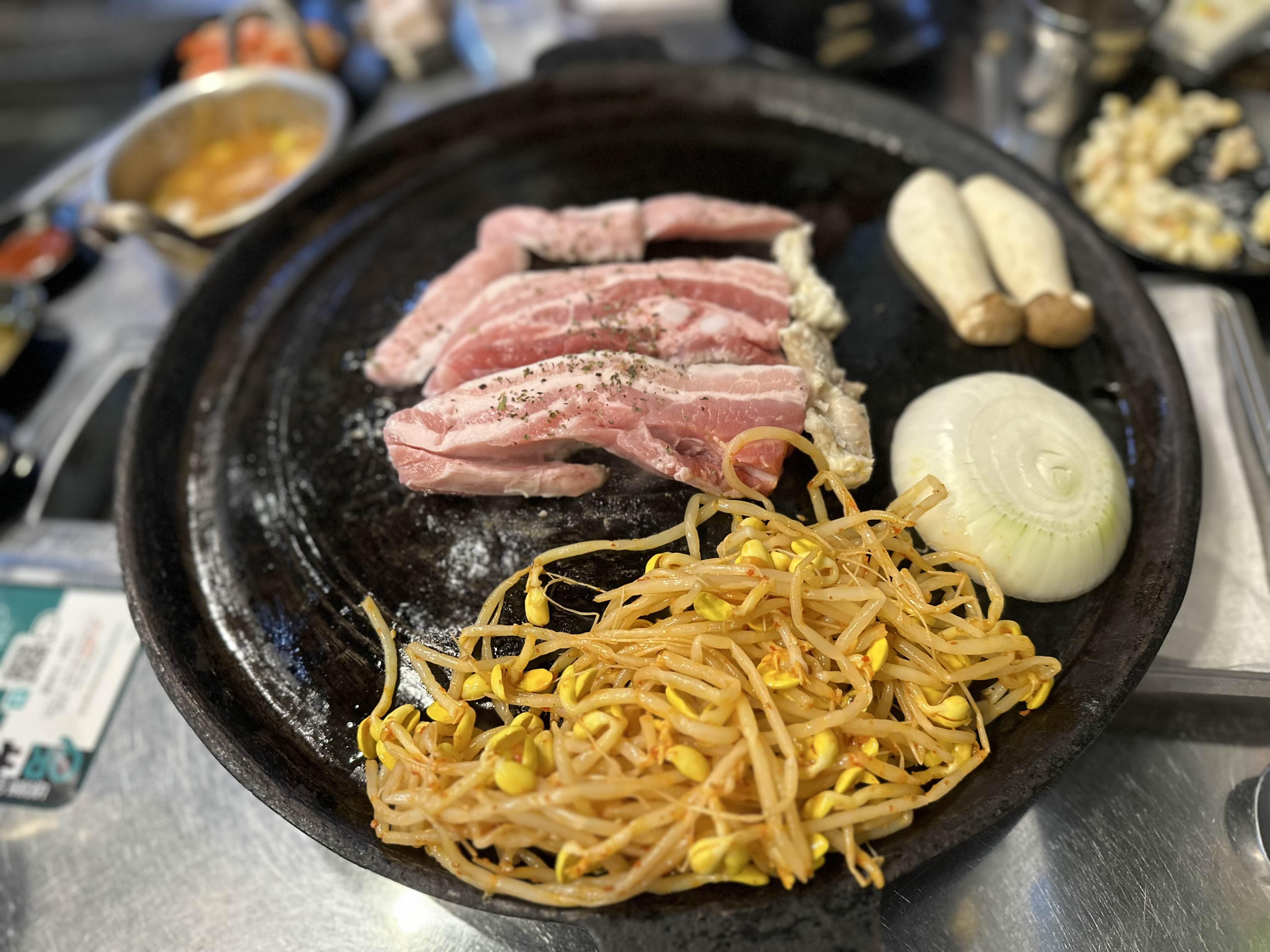 고기를 올리면 직원분께서 콩나물을 솥뚜껑에 올려주십니다. 삼겹살과 항정살, 소막창부터 올려봤습니다. 직원분께서 소막창은 오래 익히면 더 맛있다고 알려주십니다.