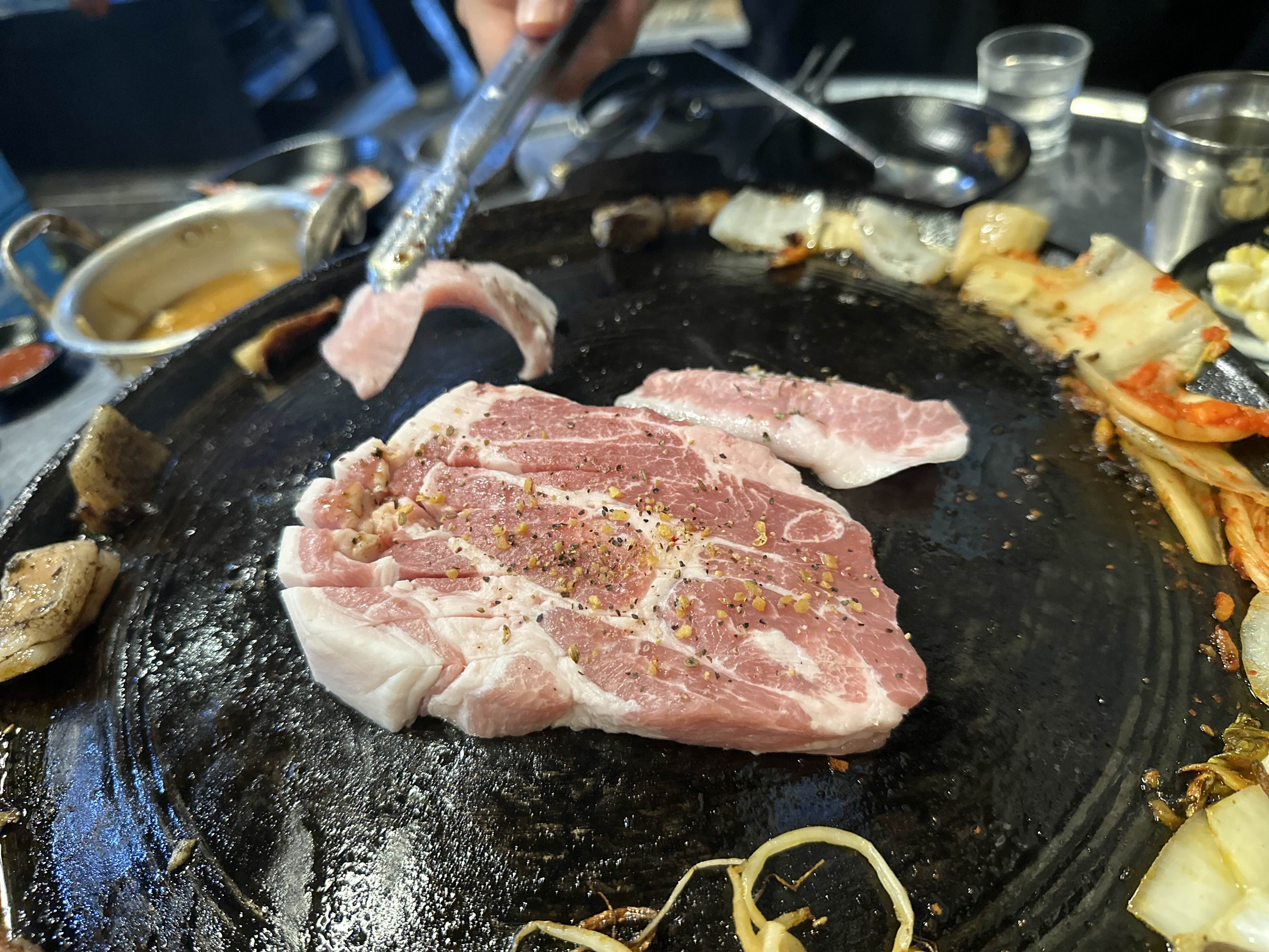 삼겹살은 신선하여 잡내는 일절 나지 않고 지방의 풍미가 좋고 살코기와 잘 어울립니다. 구운 콩나물과 김치와 같이 먹으면 더 잘 어울립니다.