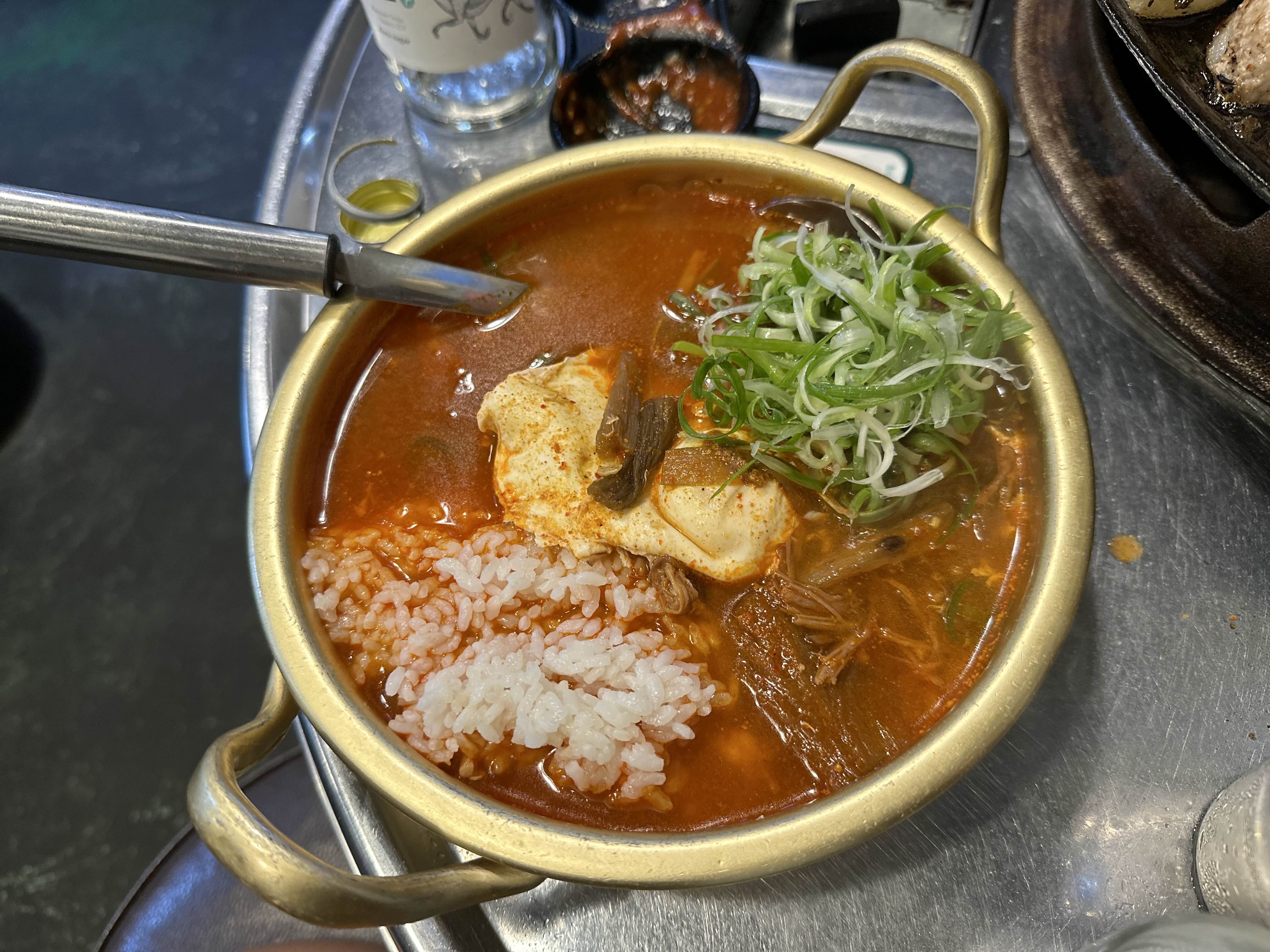 김계장 해장국이 나왔습니다. 김계장 해장국은 밥이 말아져 나오는 육개장입니다. 칼칼한 국물이 아주 맛이 좋습니다. 잘게 찢어진 양지도 꽤 많이 들어있습니다. 파절이가 올라가 있는데 은근 국물과 잘 어울립니다. 약간 느끼할 수 있는 돼지고기를 먹고 깔끔하게 마무리 하기 좋습니다.