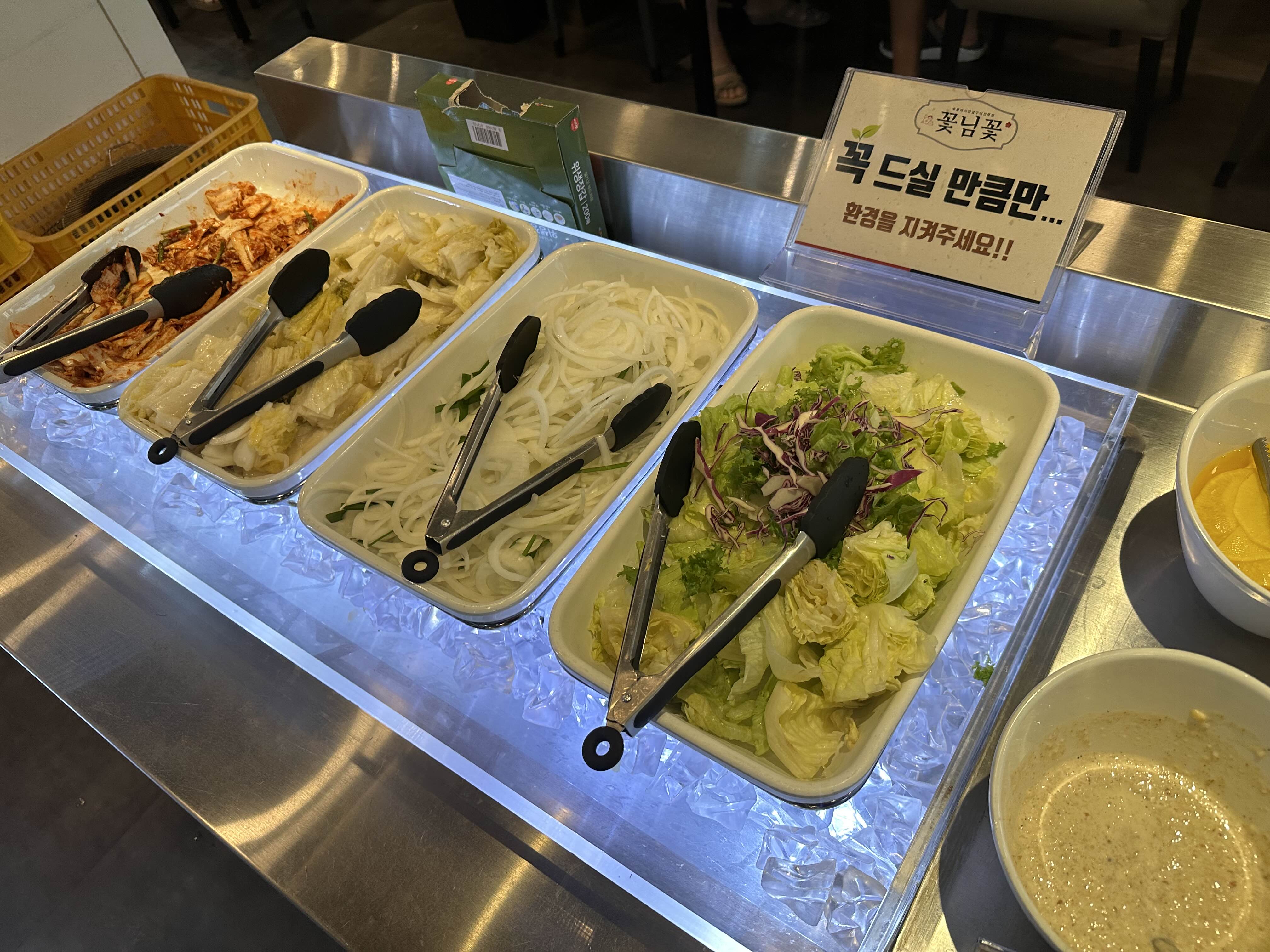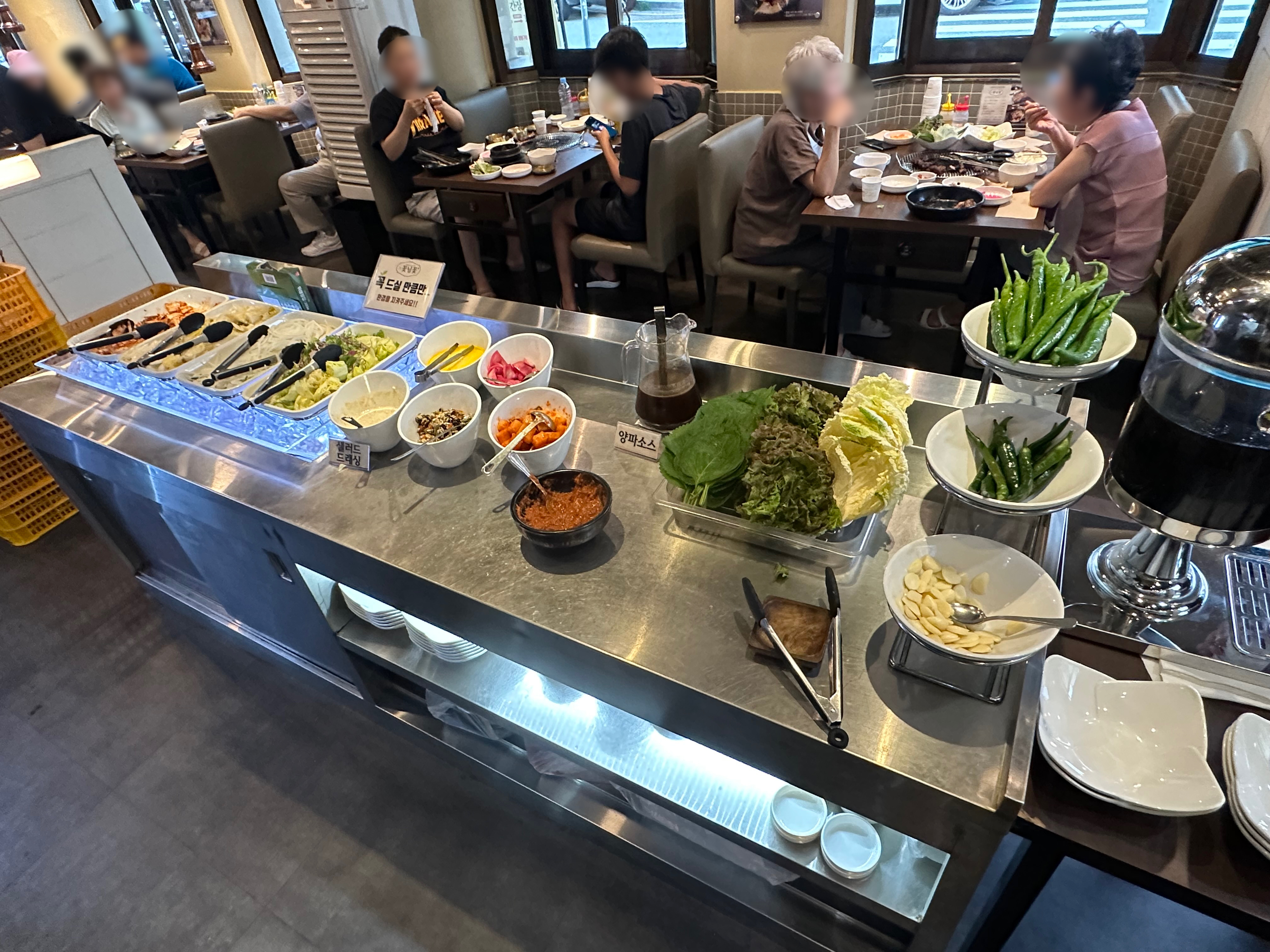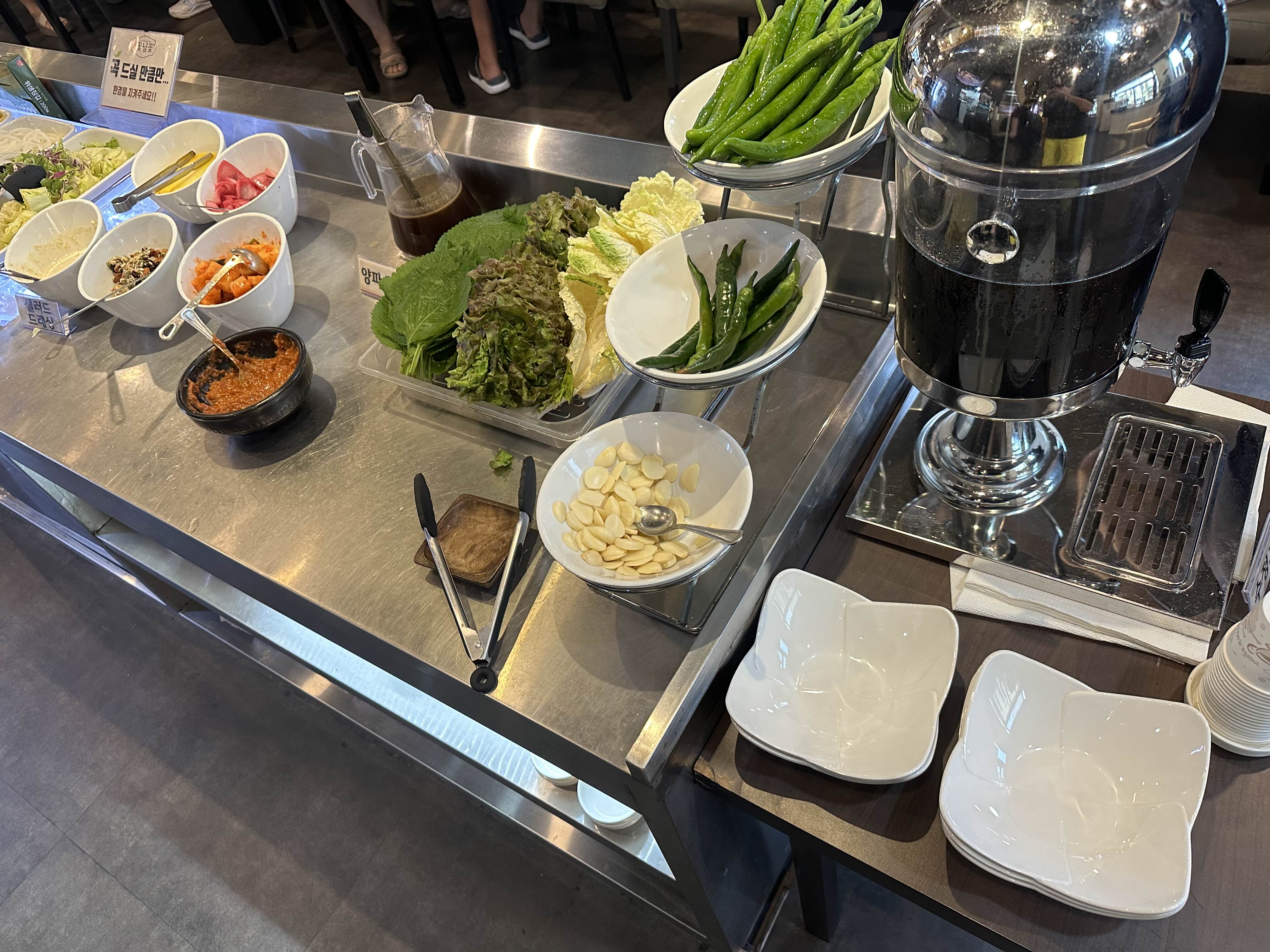 가게 한켠에 샐러드, 김치, 쌈, 수정과등을 셀프로 이용할 수 있는 셀프바가 있습니다.