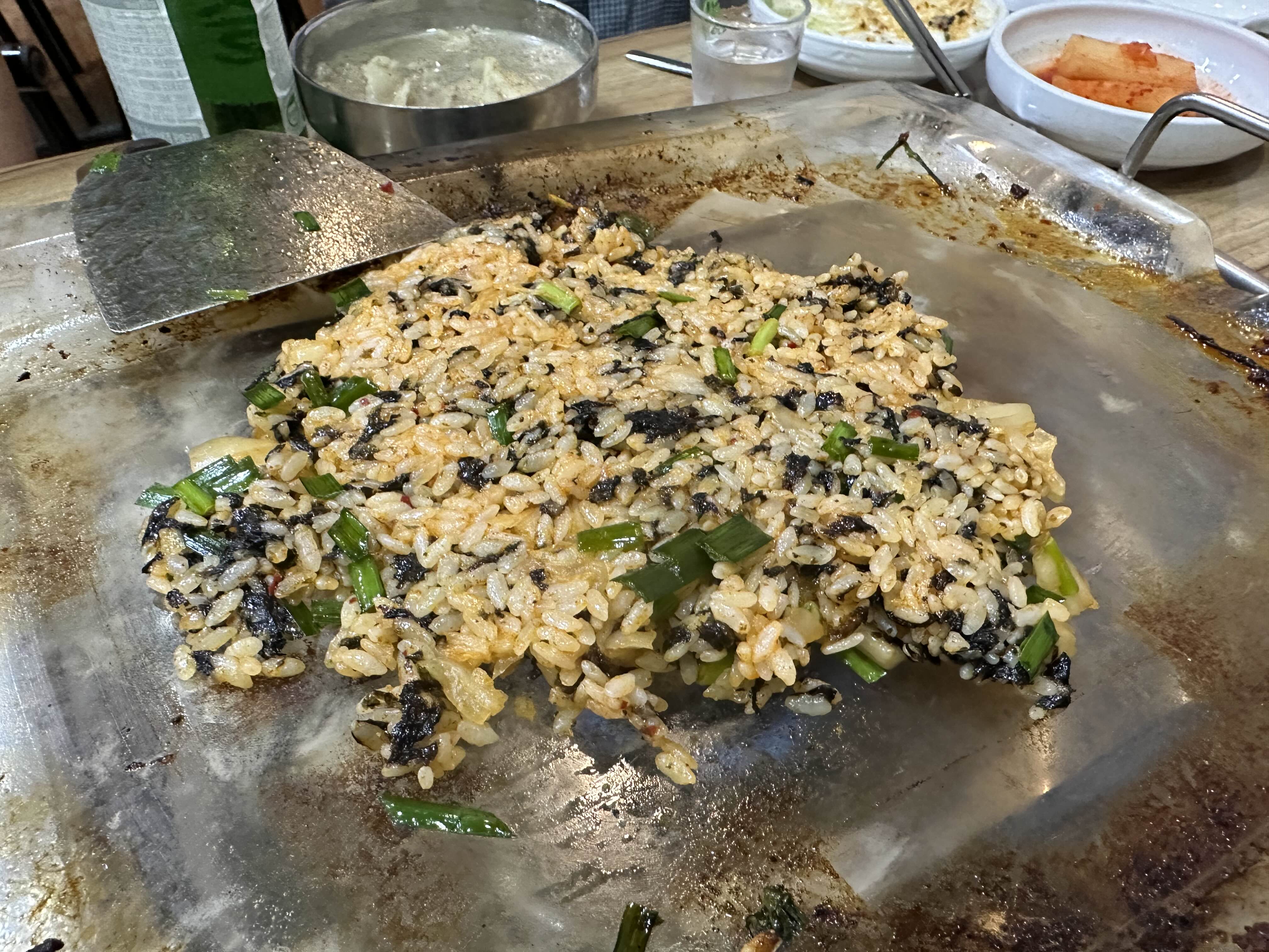 볶음밥(₩2,000)도 주문했습니다. 볶음밥은 별다른 양념이 없어 약간 싱겁습니다. 볶음밥을 볶을 때는 고기와 부추 콩나물 무침을 약간 남겨두어 같이 볶으시길 추천드립니다. 그냥 먹기엔 좀 심심한 맛이 강합니다.