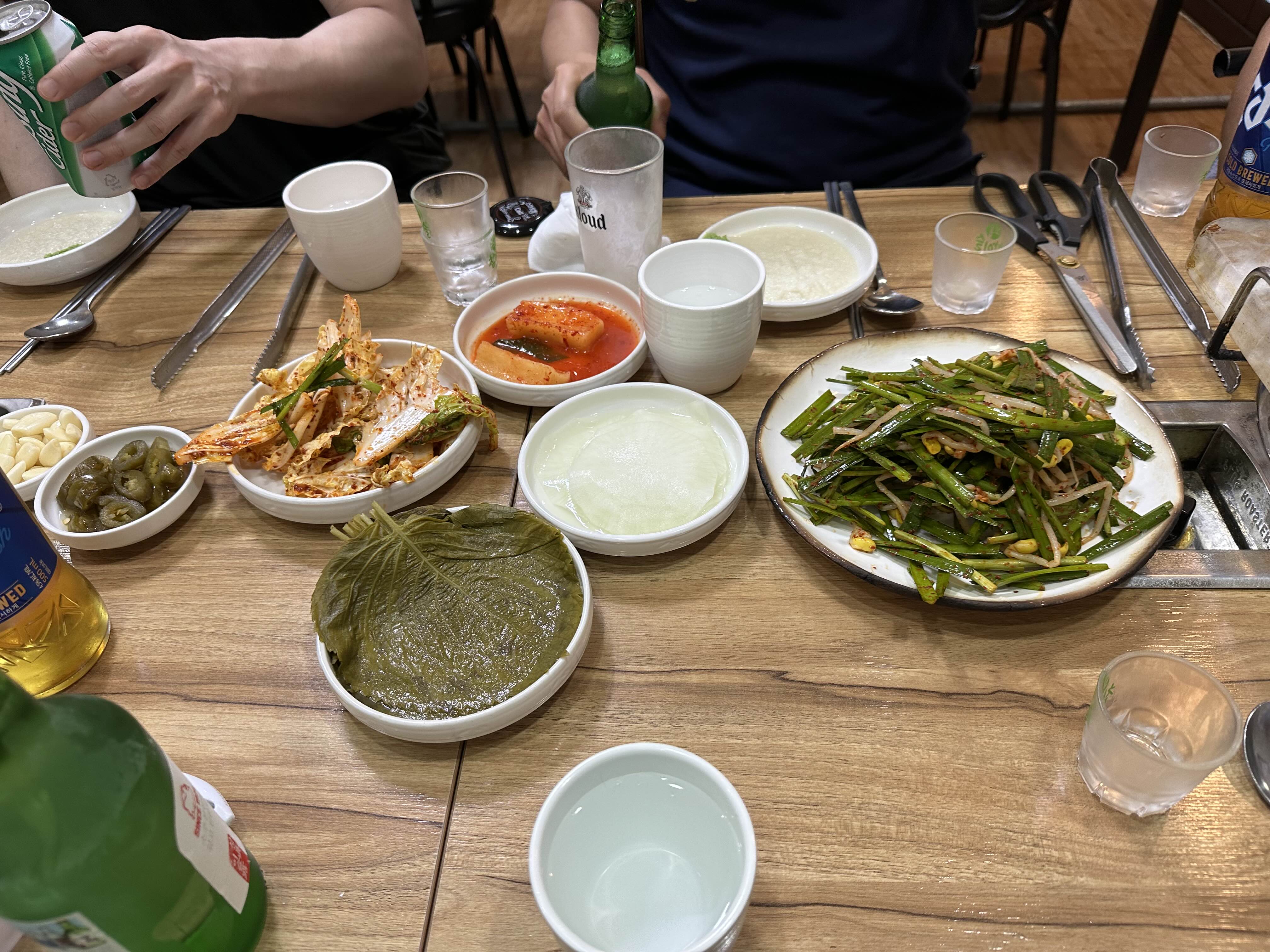 고추절임과 배추 겉절이 마늘, 깻잎, 쌈무, 섞박지와 와사비를 곁들인 마소스가 기본으로 제공됩니다. 오리부추구이는 생오리로스와 부추콩나물 무침이 따로 나옵니다.