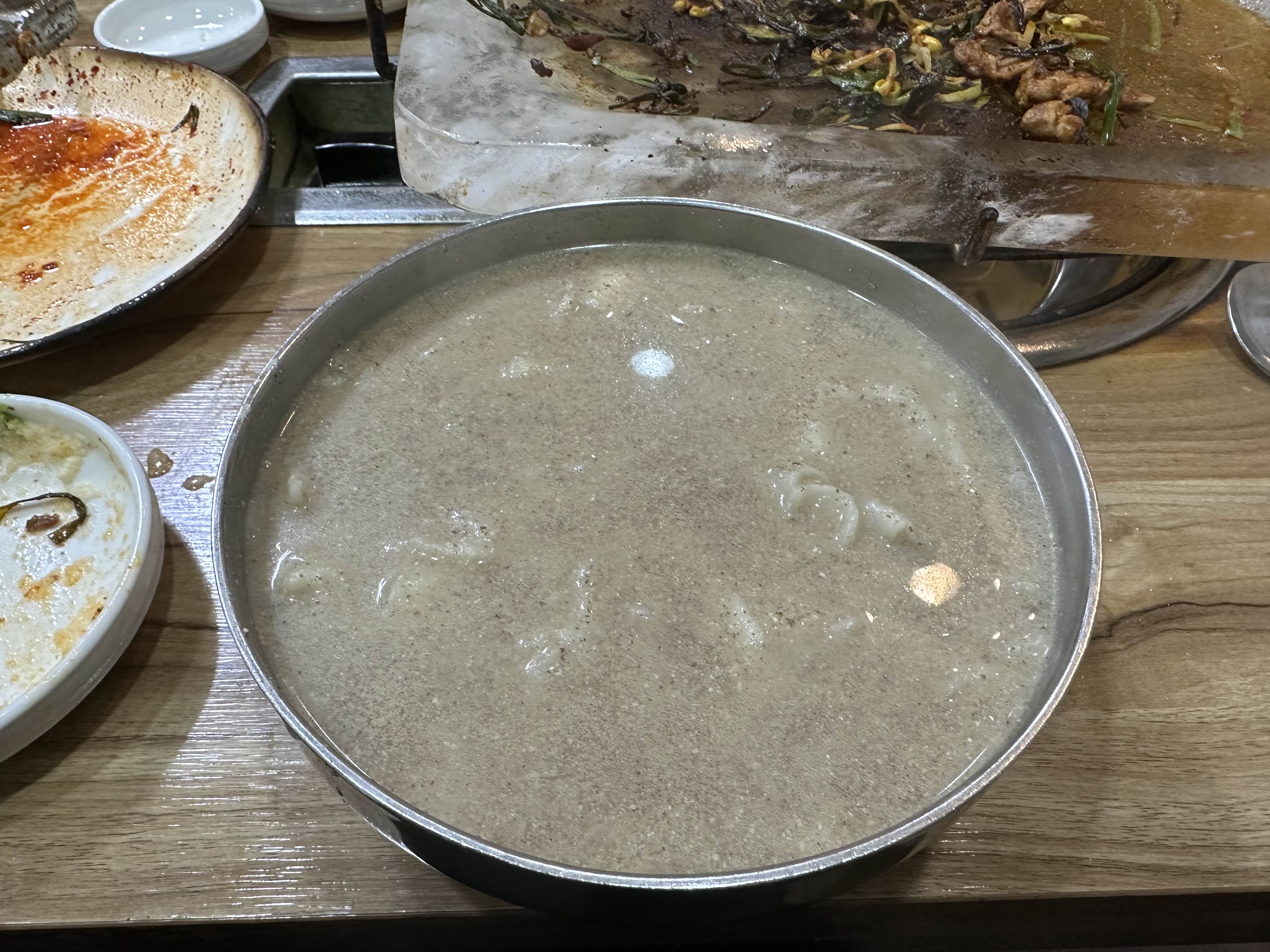 오리부추구이를 주문하면 후식으로 기본 제공되는 들깨 손 수제비입니다. 들깨가 많이 들어가있어 정말 고소한 맛이 좋습니다. 깊은 고소한 맛과 수제비도 쫀득쫀득 맛있어 마무리로 정말 좋은 음식입니다. 해장도 잘 되는 느낌입니다.