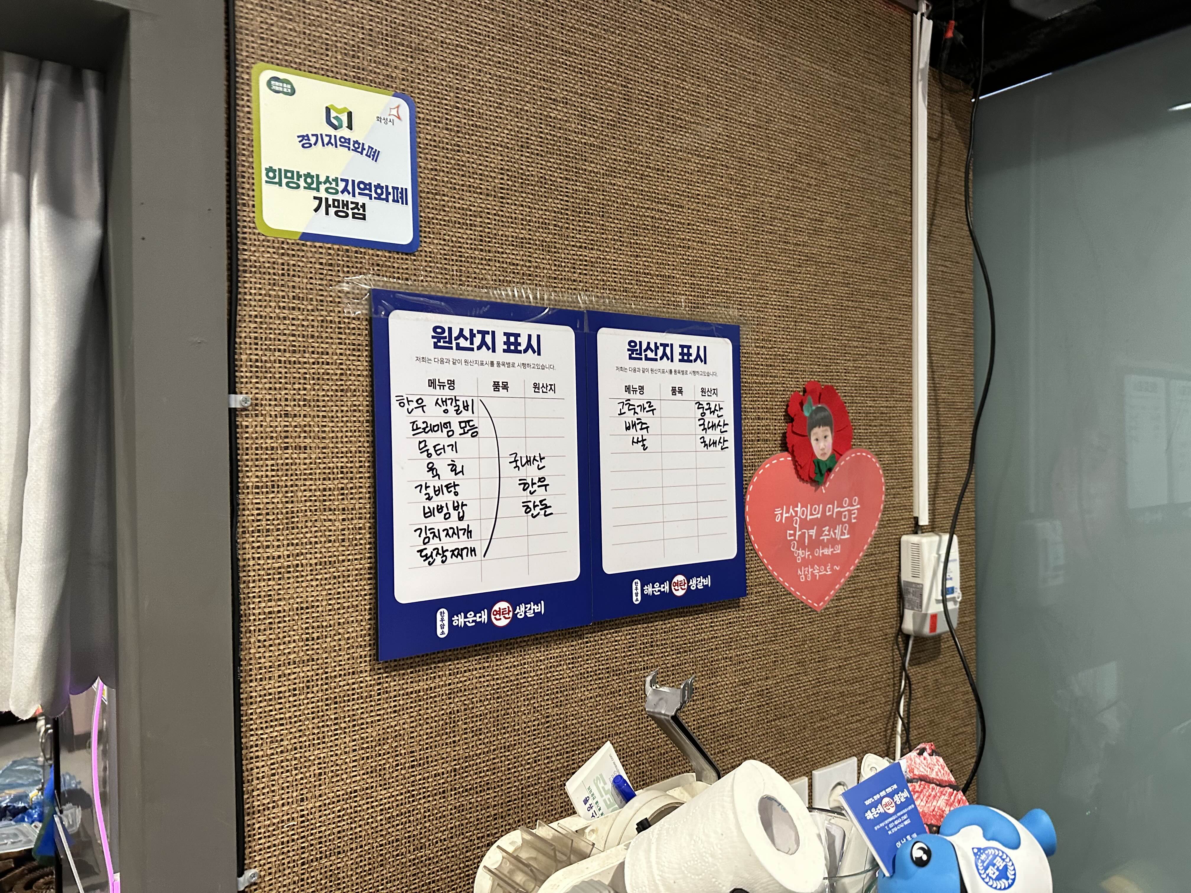 원산지는 고기류는 모두 국내산 한우와 한돈을 사용하고 쌀과 배추도 국내산, 고춧가루만 중국산을 사용합니다.