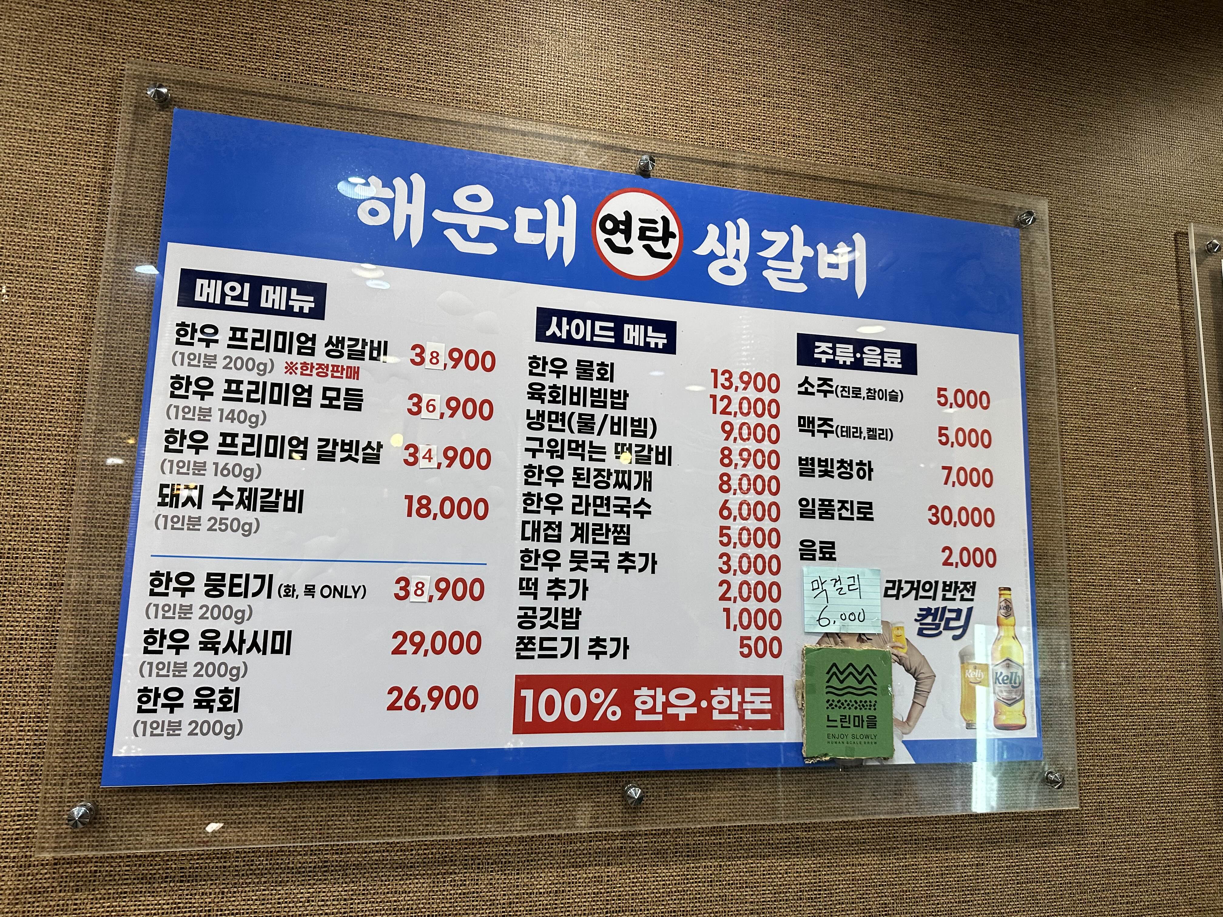 한우 생갈비와 갈빗살, 한우 모듬구이, 돼지 수제갈비의 구이메뉴와 한우 뭉티기, 육사시미, 육회등 메인메뉴와 한우 물회, 육회비빔밥, 떡갈비, 한우 라면국수 등 다양한 메뉴를 판매중입니다.