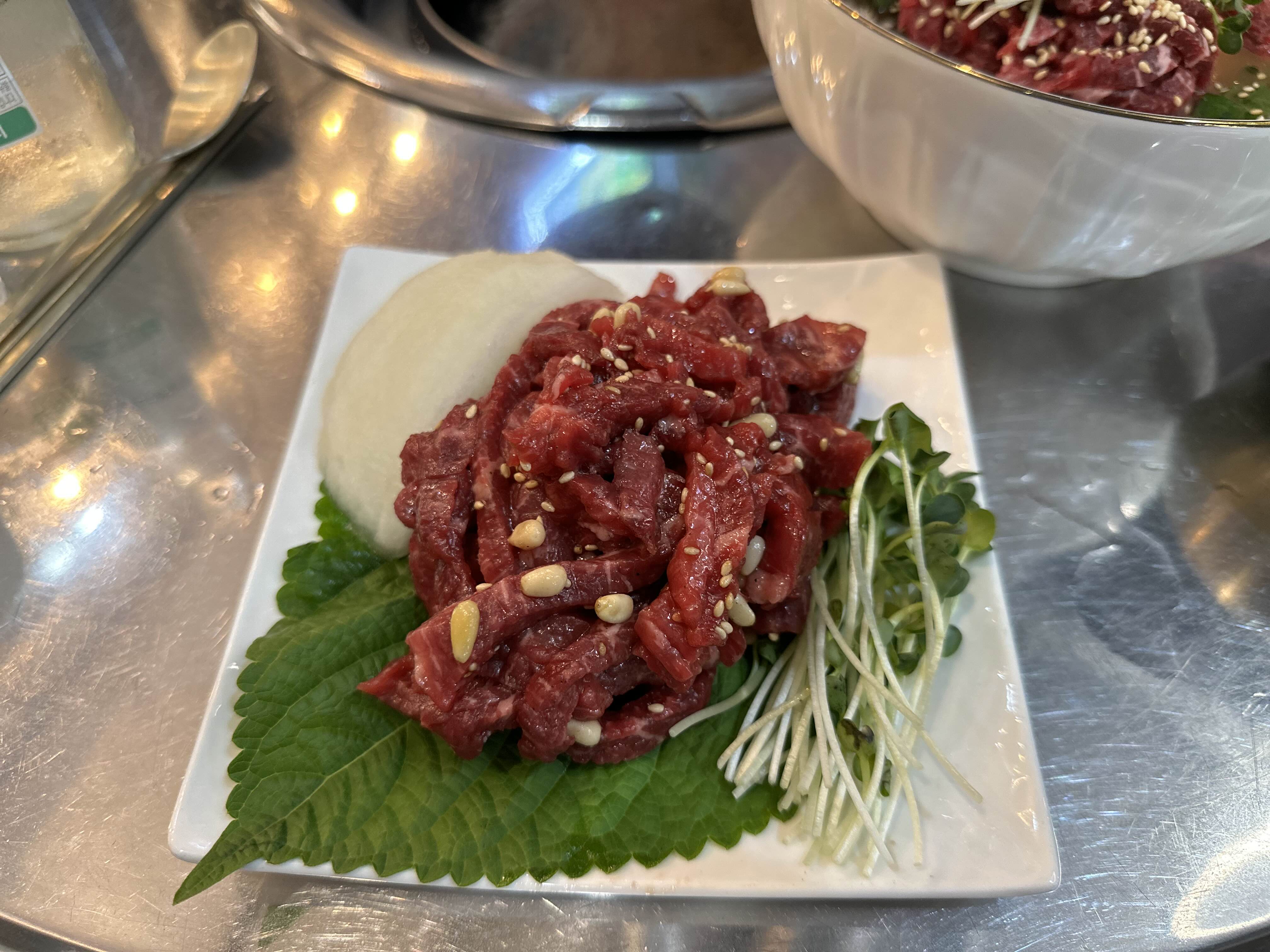 200g의 양이 적어보일 수도 있는데 먹어도 먹어도 거의 끝이 보이지 않을 정도의 양이라 넉넉하게 먹었습니다. 육회와 한우 물회도 맛있는데 다음에 방문해 뭉티기도 먹어보고 구이도 먹어봐야겠습니다.