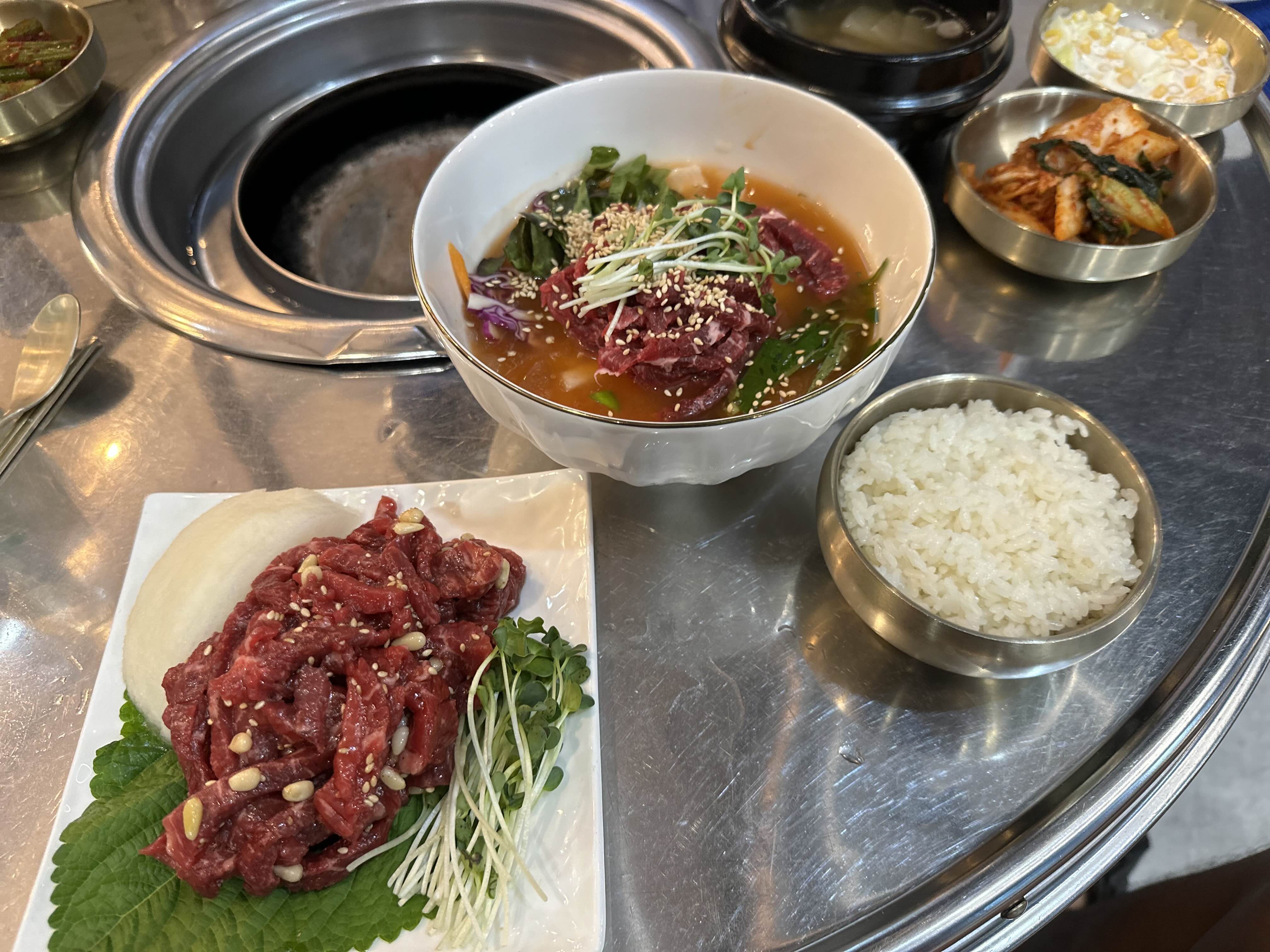 물회에 들어있는 육회도 고소하고 육질이 정말 좋았습니다. 물회 국물도 시원하고 약간 매콤해서 술이 아주 술술 들어갔습니다. 양상추와 당근 깻잎 등 채소도 신선한 맛과 식감이 육회와 잘 어울렸습니다. 밥도 맛있어서 좀 식힌 후 말아먹으니 별미였습니다.