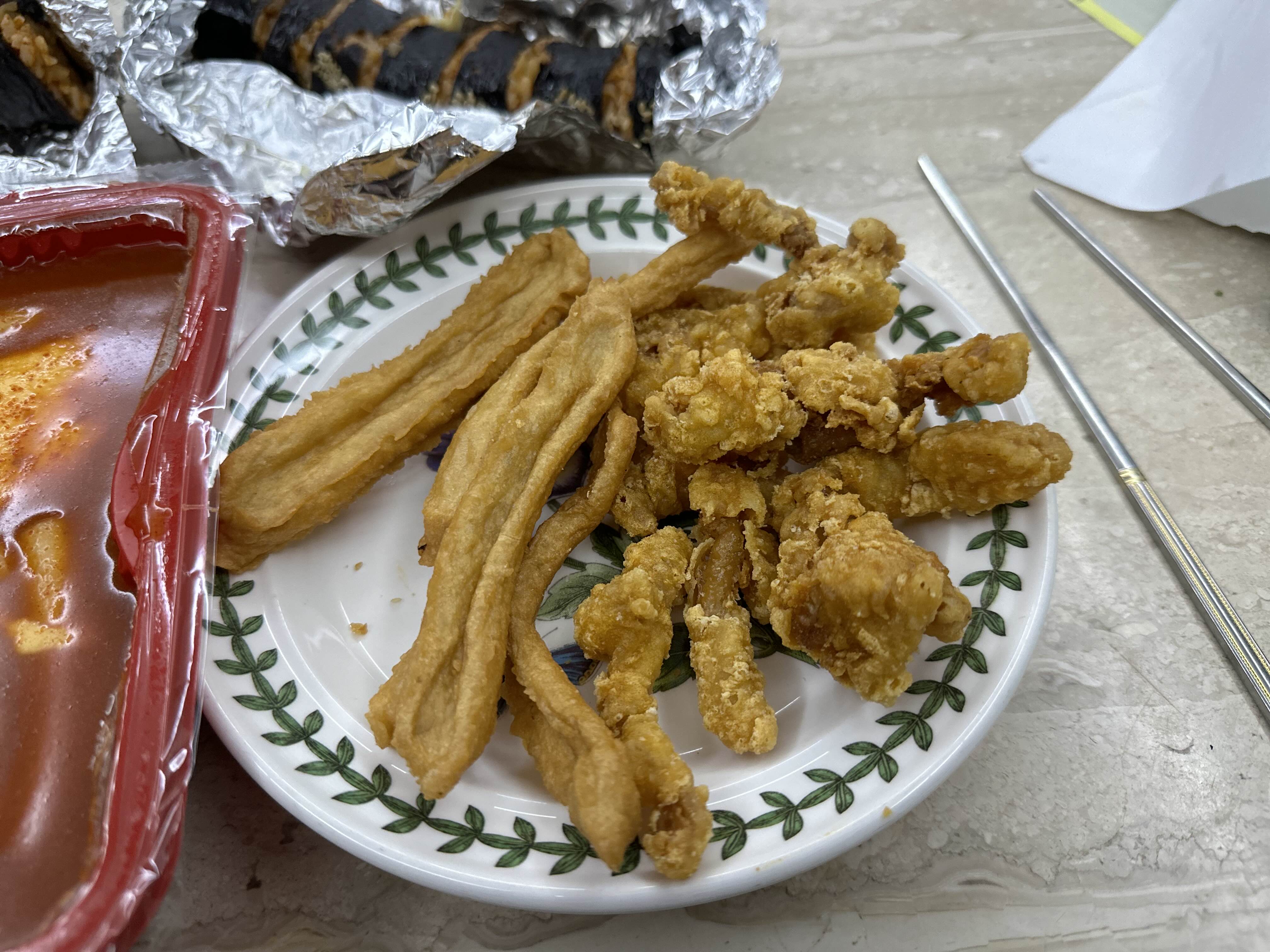 닭껍질 튀김과 오뎅 튀김 모두 떡볶이 소스에 찍어먹으면 더 맛이 좋습니다.