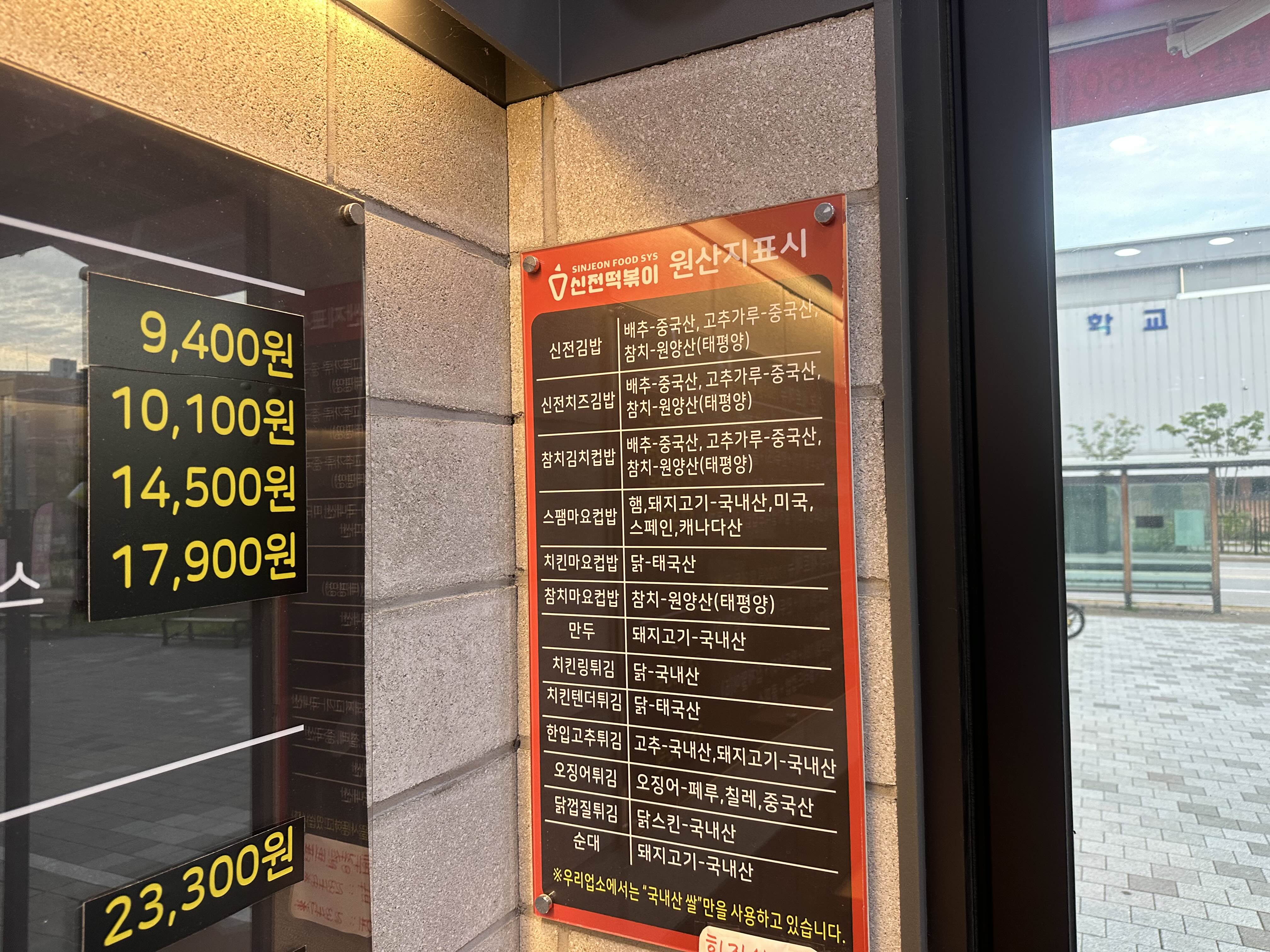 떡볶이 종류는 기본 떡볶이와 치즈떡볶이, 로제떡볶이가 있고 튀김은 오뎅튀김, 만두 튀김, 김말이, 닭껍질 튀김 등이 있고 김밥류로는 빨간 김밥인 신전김밥도 유명한 메뉴입니다.