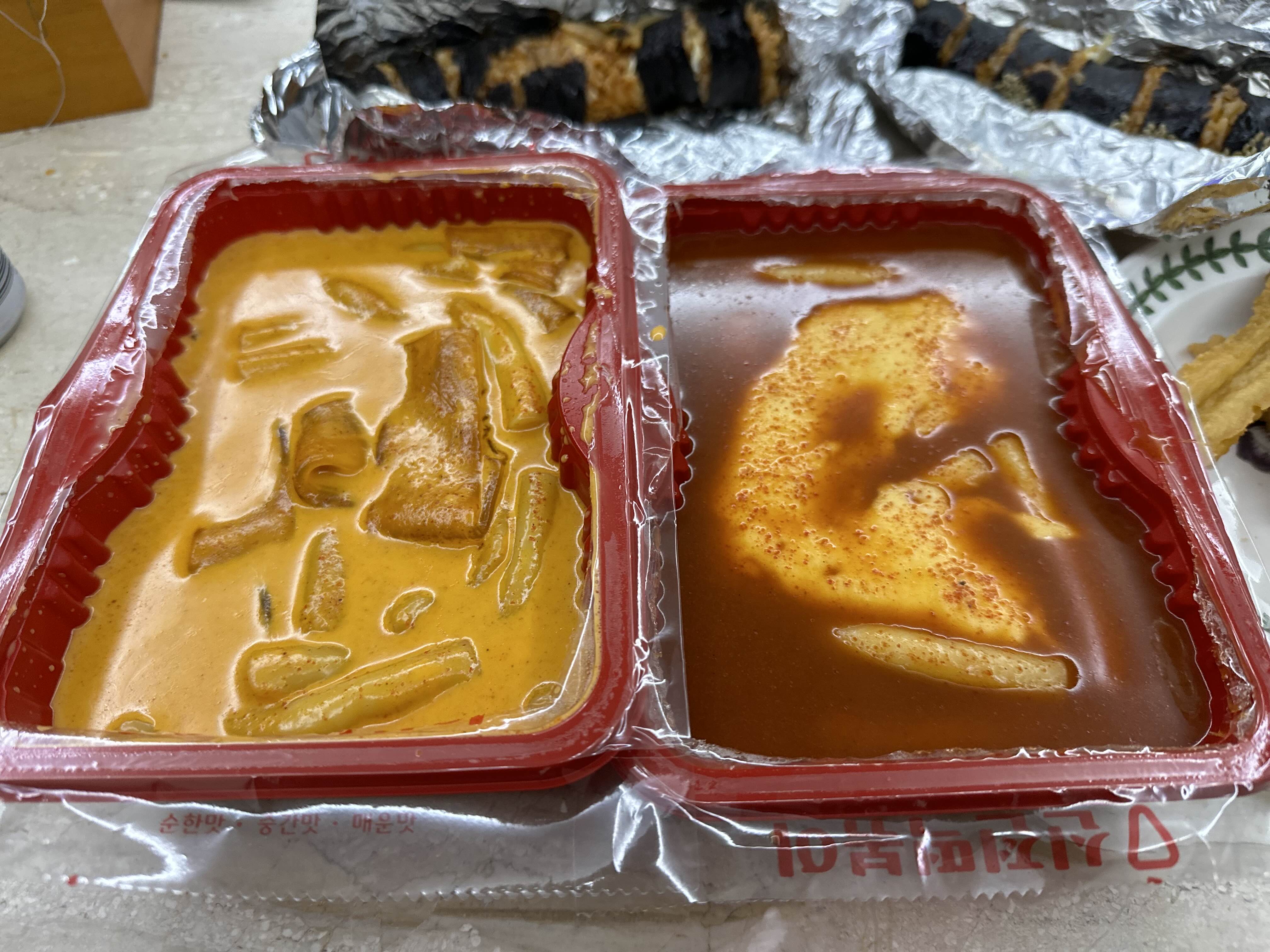 치즈 떡볶이의 치즈는 좀 굳어서 뭉쳐있었습니다. 일반 떡볶이는 보통맛은 개인적으로 맵고 순한맛이 살짝 매콤하니 맛이 좋아 순한맛으로 먹고는 합니다. 매콤한 맛을 치즈가 중화시켜줍니다.