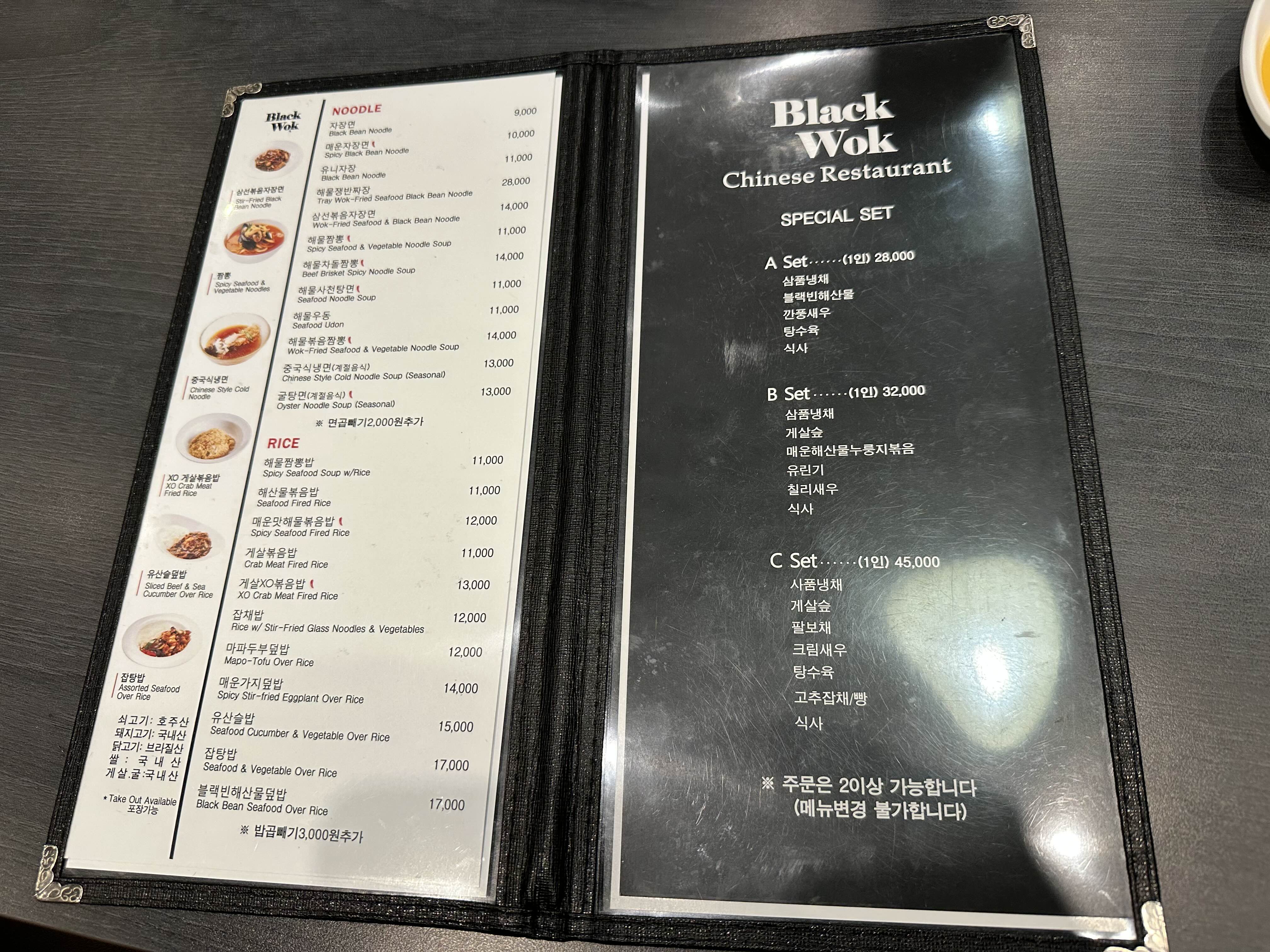 여러 일반 중국 음식점에서 파는 메뉴들은 웬만하면 다 있습니다. 사실 간짜장과 탕수육이 먹고싶어 중국집에 방문했는데 간짜장이 메뉴판에 없어 유니짜장으로 주문했습니다. 유니짜장 곱빼기(2천원 추가)와 해물차돌짬뽕밥(해물차돌짬뽕과 가격 동일, 14,000원), 탕수육 중짜리를 주문했습니다.