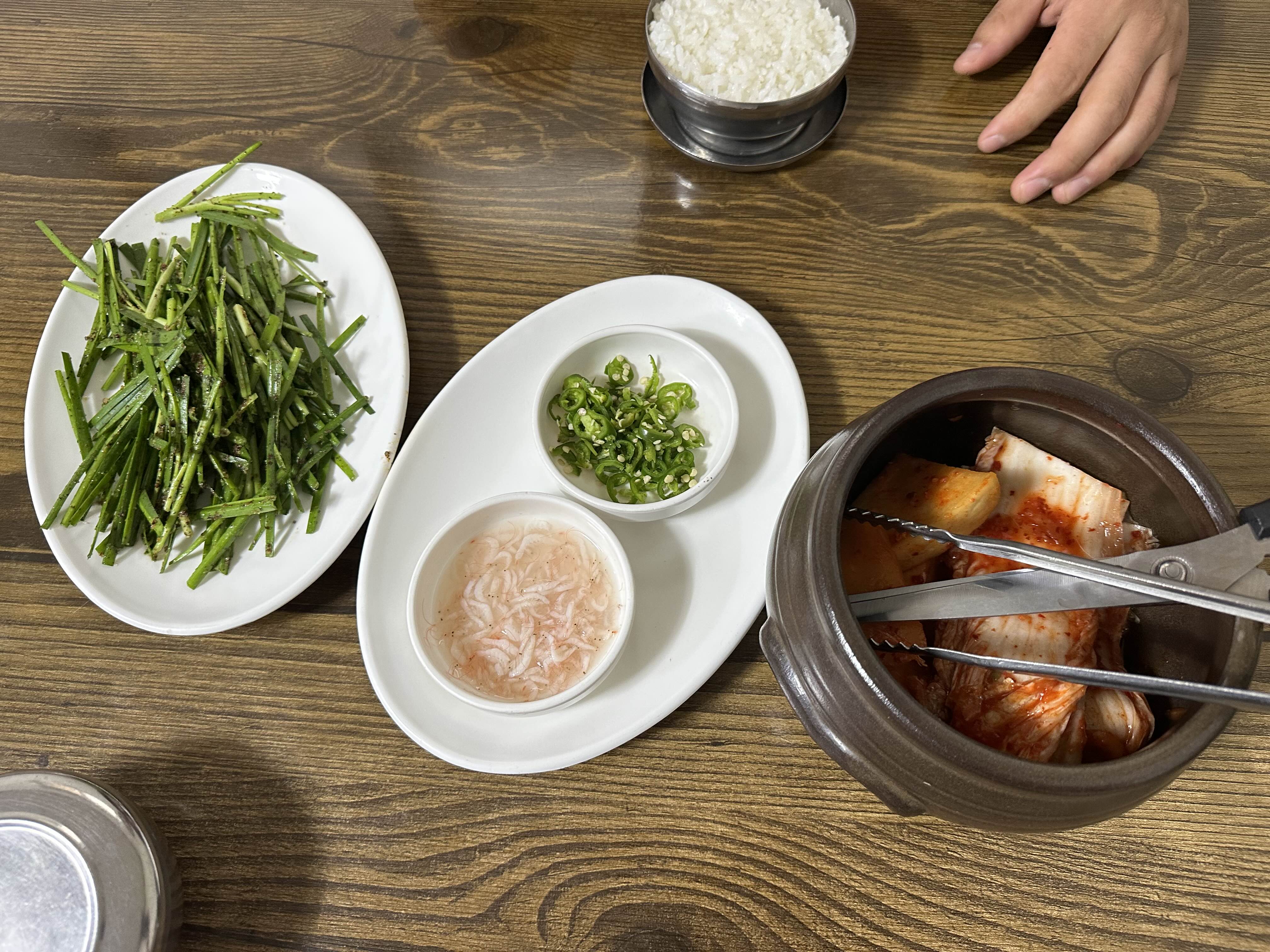 부추무침과 새우젓, 청양고추가 기본으로 나오고 배추김치와 깍두기가 나옵니다. 테이블마다 들깨가루와 후추도 있어 취향껏 넣어드시면됩니다.
