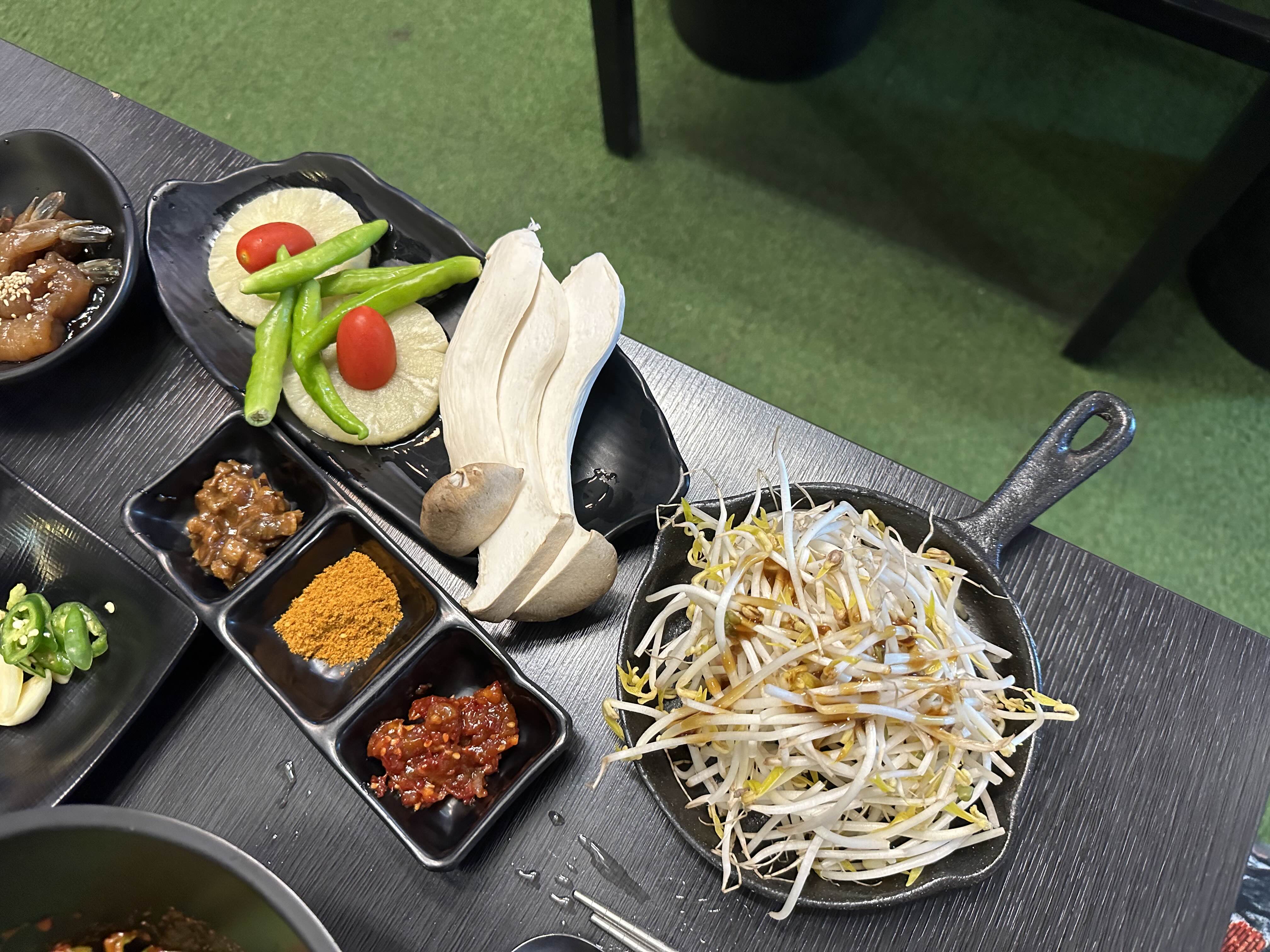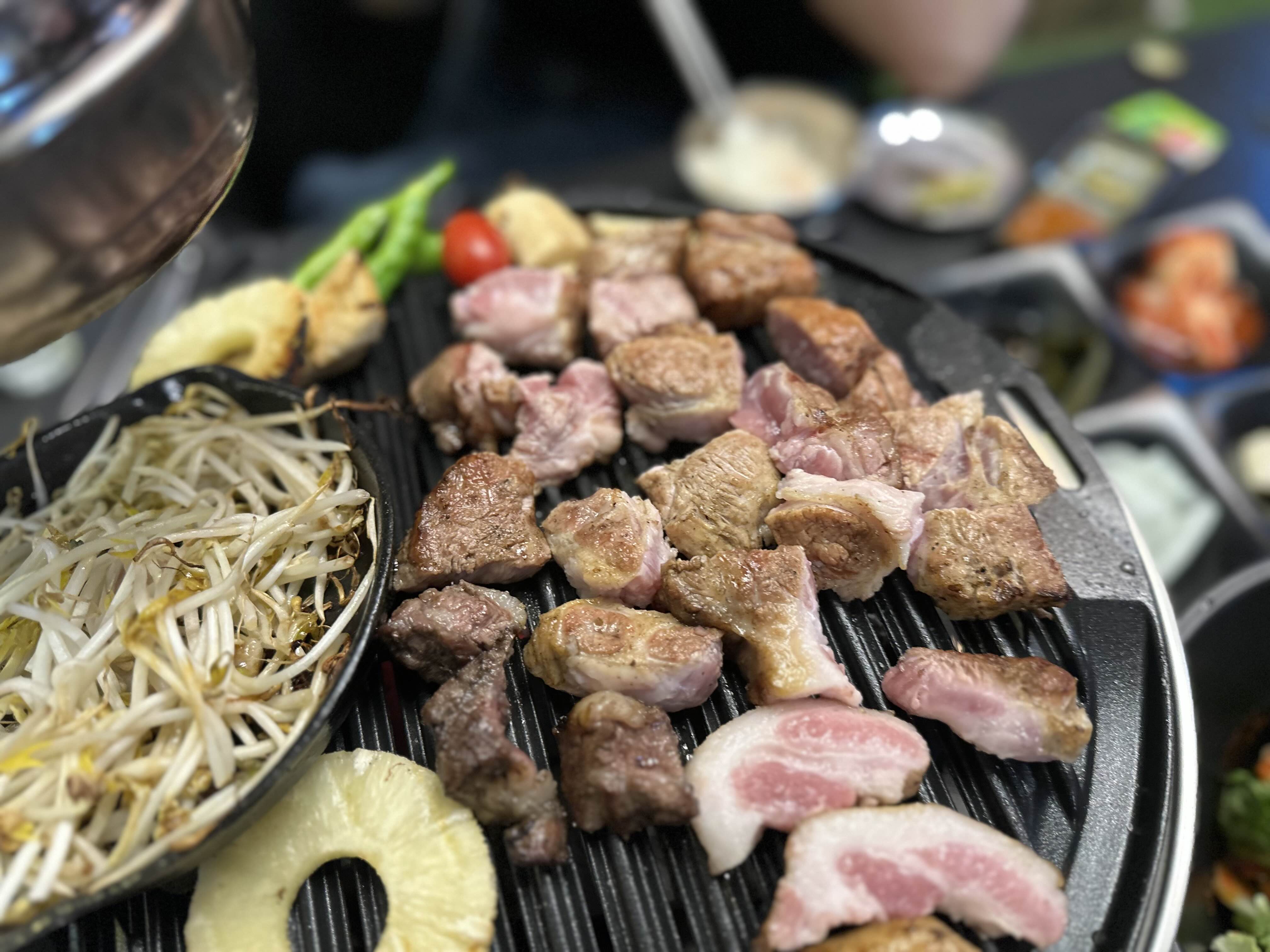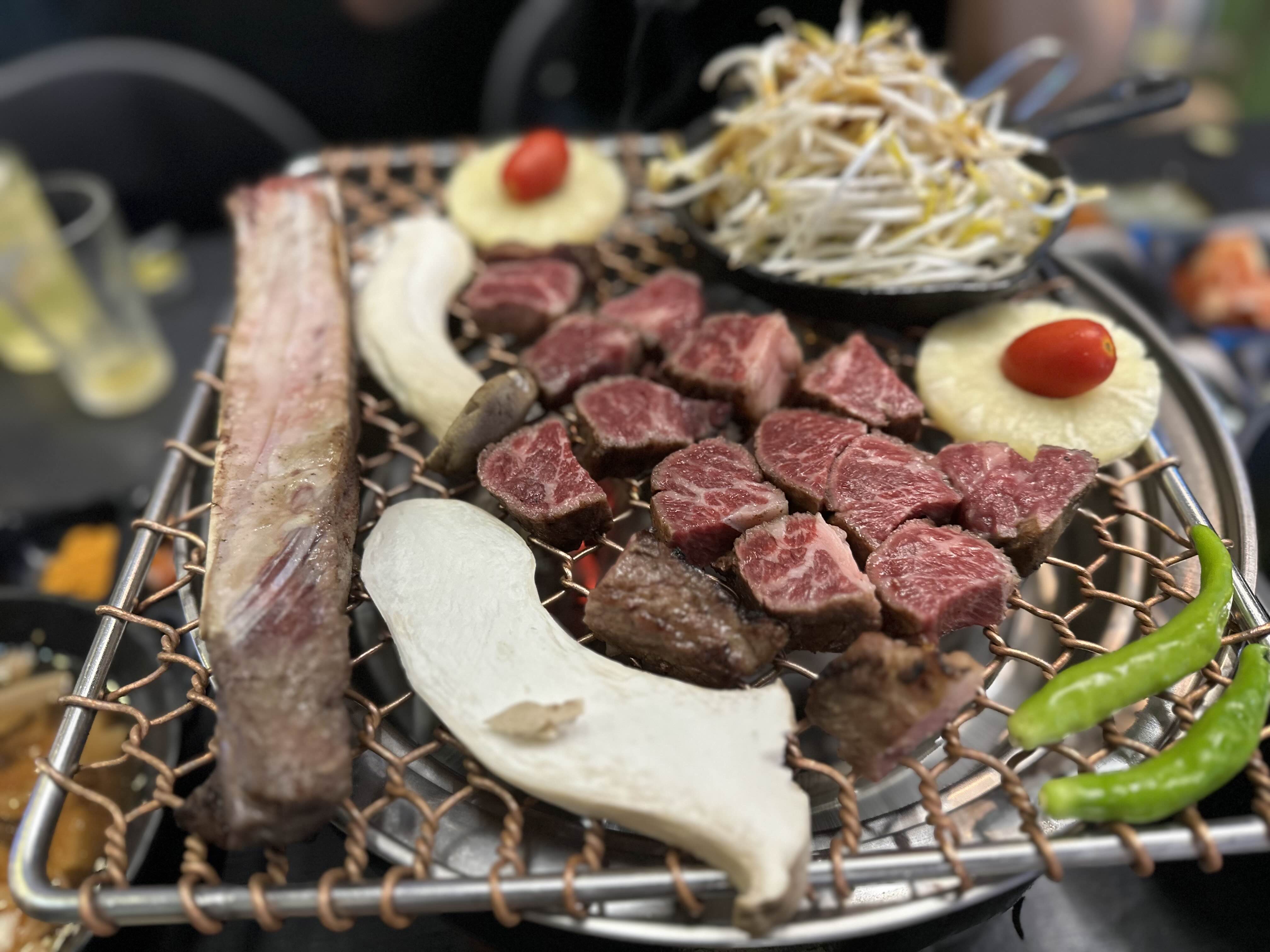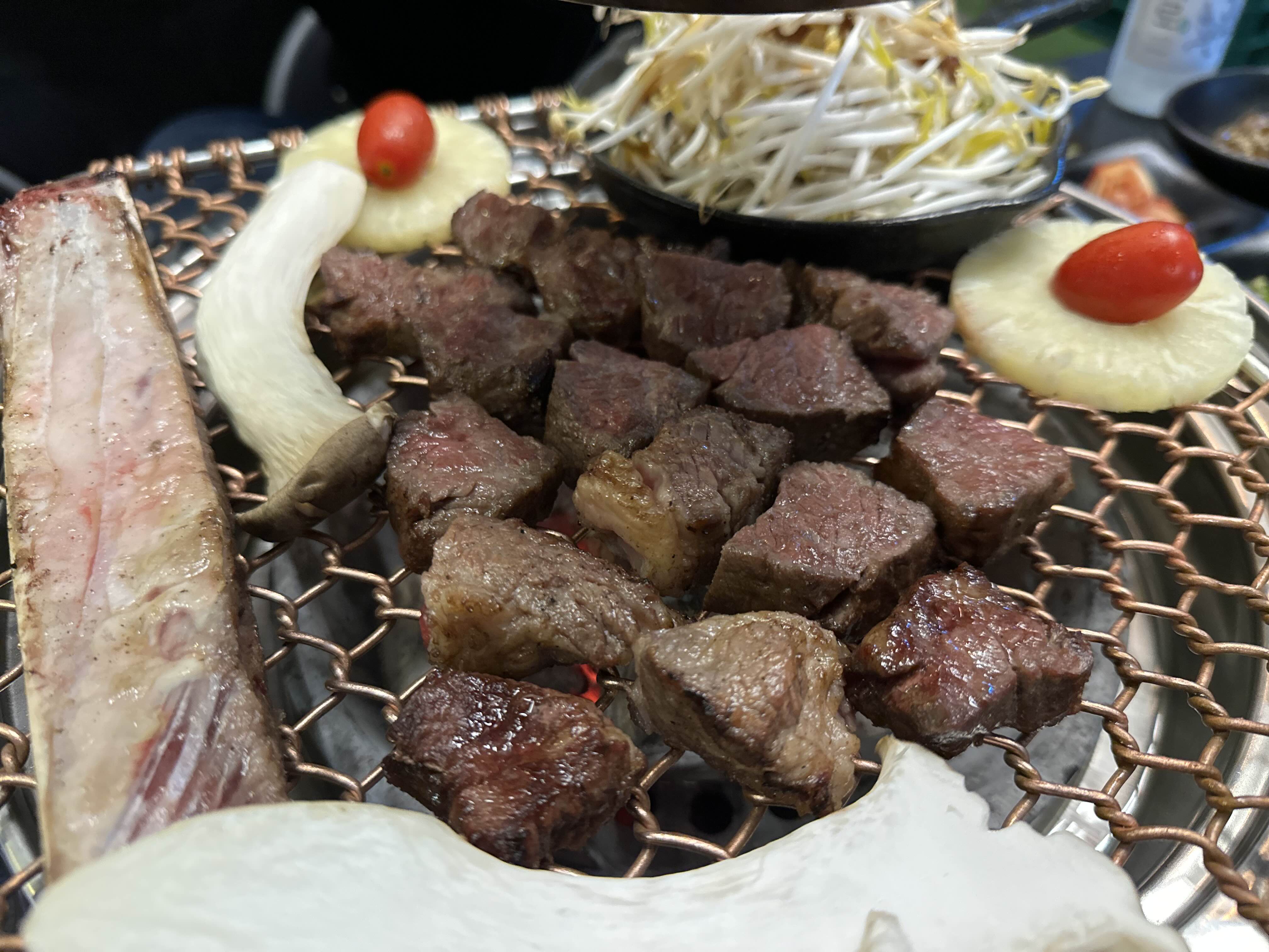 고기와 같이 나온 숙주, 새송이버섯, 고추, 방울토마토, 파인애플입니다. 숙주 아래 소 기름이 들어있어 숙주가 볶아지면서 지방향이 고소하게 맛이 좋습니다. 파인애플과 토마토도 구워먹으니까 단맛이 더 올라왔습니다.