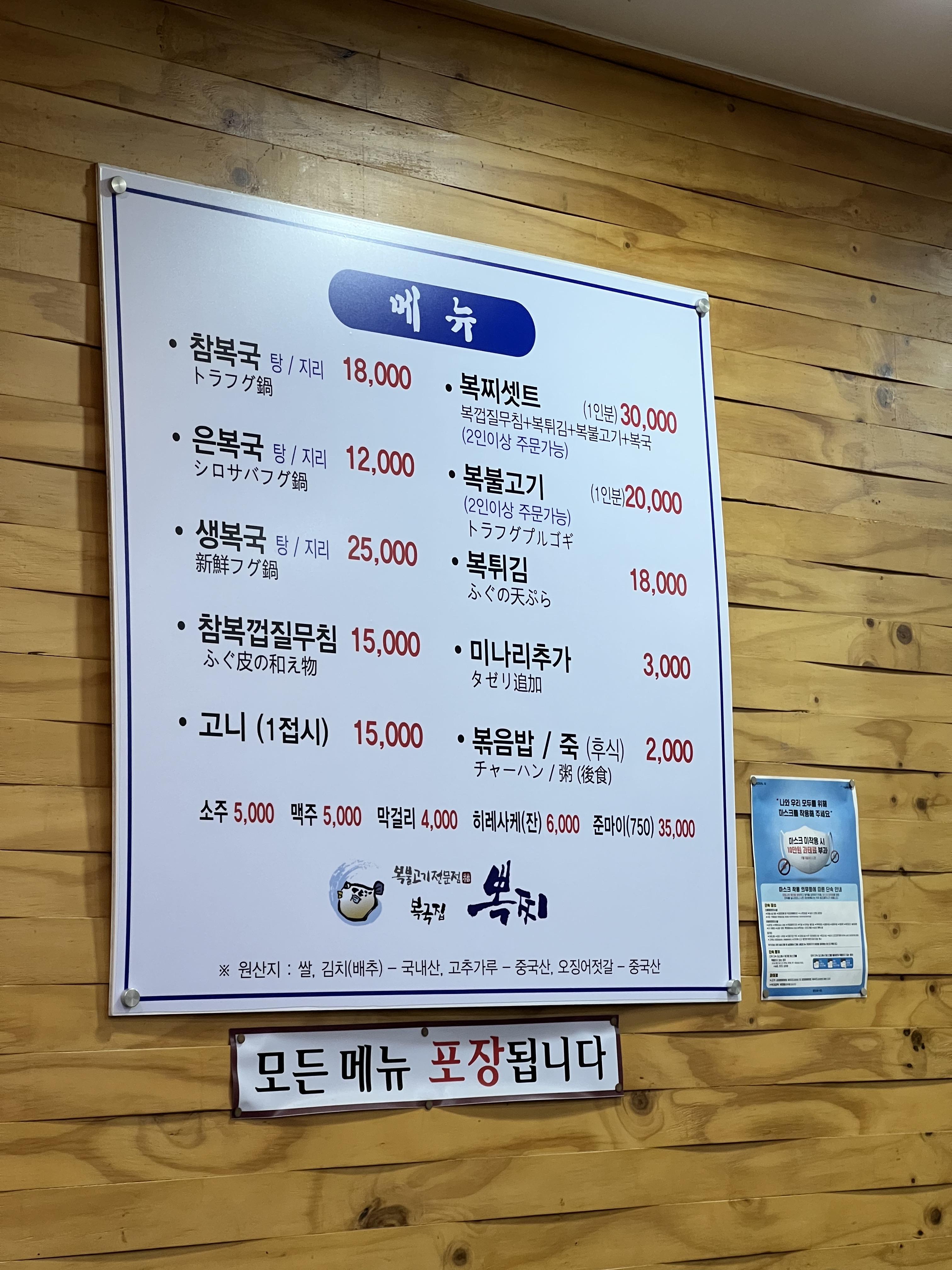 메뉴판입니다. 복껍질무침과 복튀김, 복불고기,