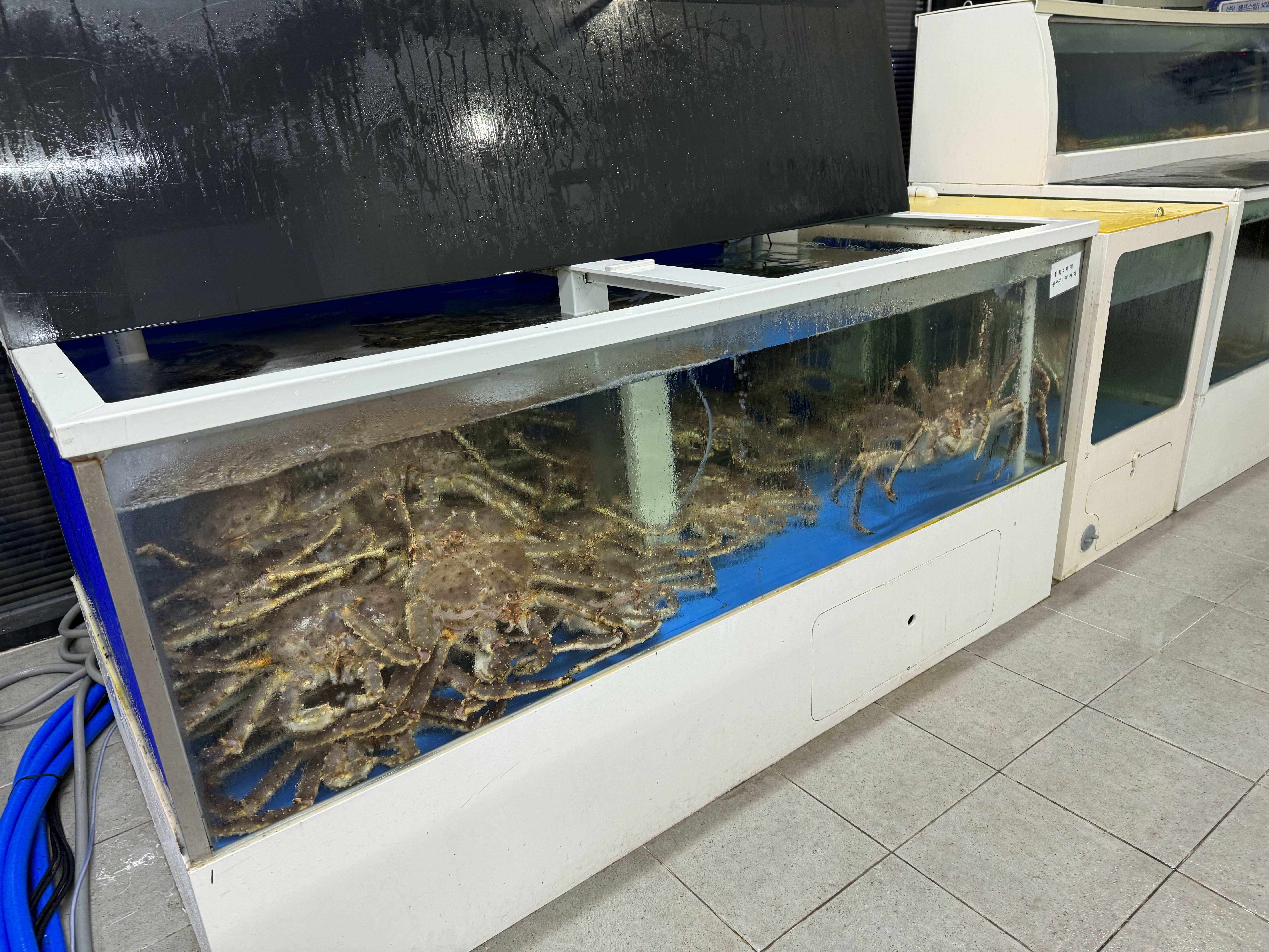 내부에서 취식은 안되고 포장만 가능해보입니다. 수조에 대게와 킹크랩, 가리비 등이 있습니다. 대게 3마리를 예약했고 현장에서 아귀포가 맛있어보여 아귀포도 12,000원에 구매 했습니다.