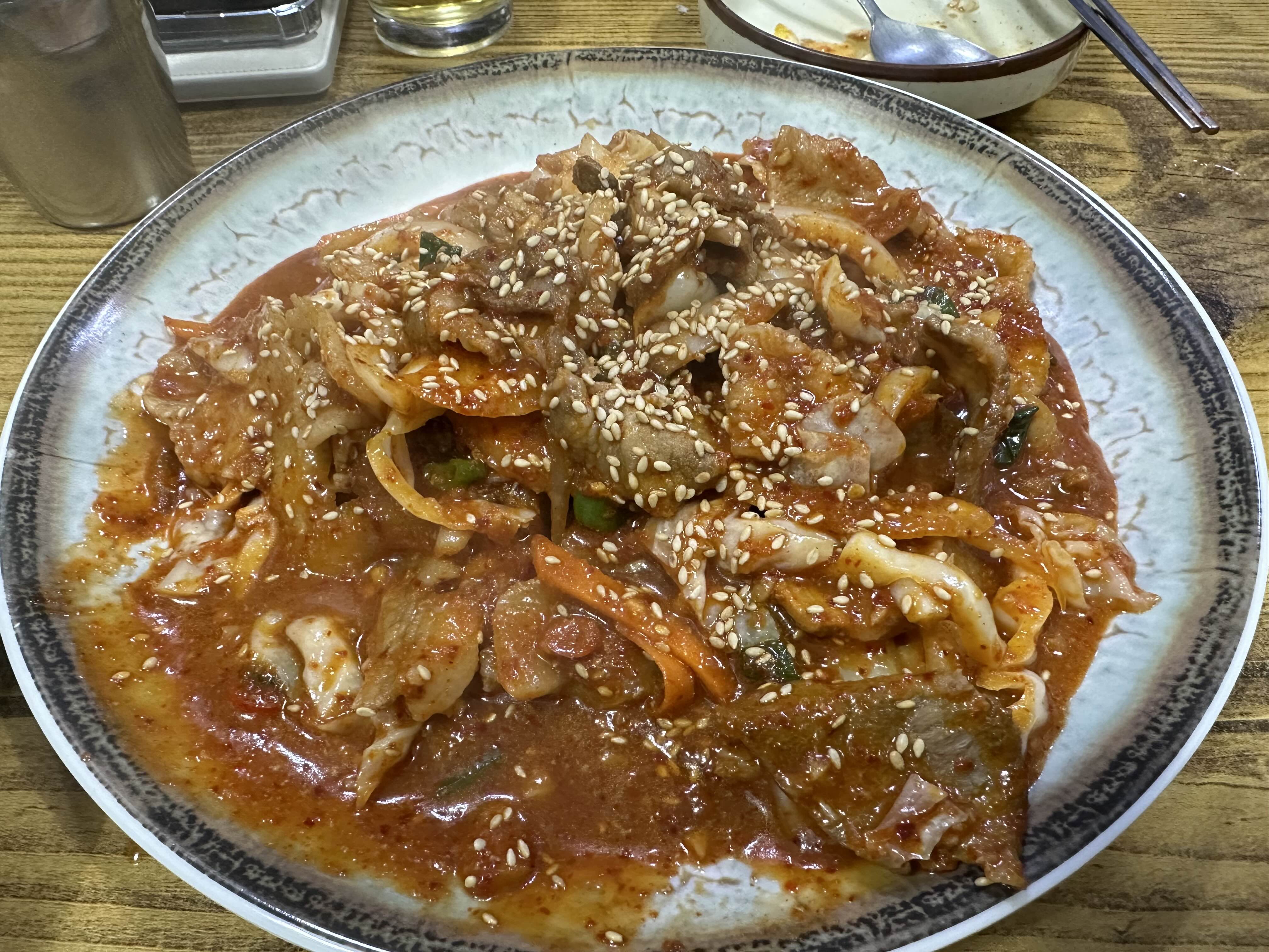 제육볶음(₩12,000)과 뚝배기순두부(₩6,000)를