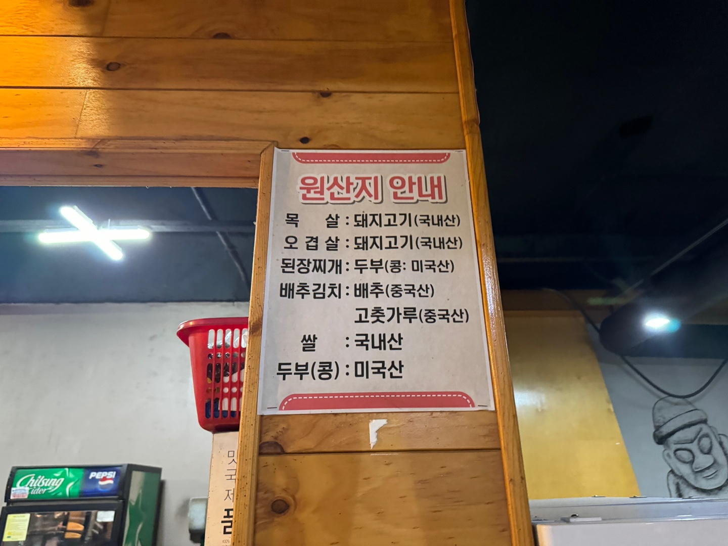 원산지는 돼지고기는 국내산(제주산)이고 콩은 미국산, 쌀과 배추는 국내산, 고춧가루는 중국산입니다.