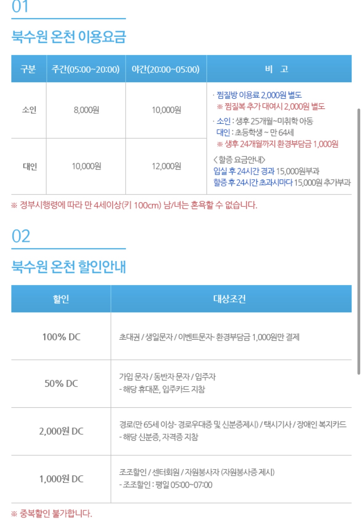 북수원온천의 목욕요금은 주간기준 대인10,000원, 소인 8,000원이고 20시 이후로는 2천원씩 추가, 찜질복은 추가 2천원 추가입니다.