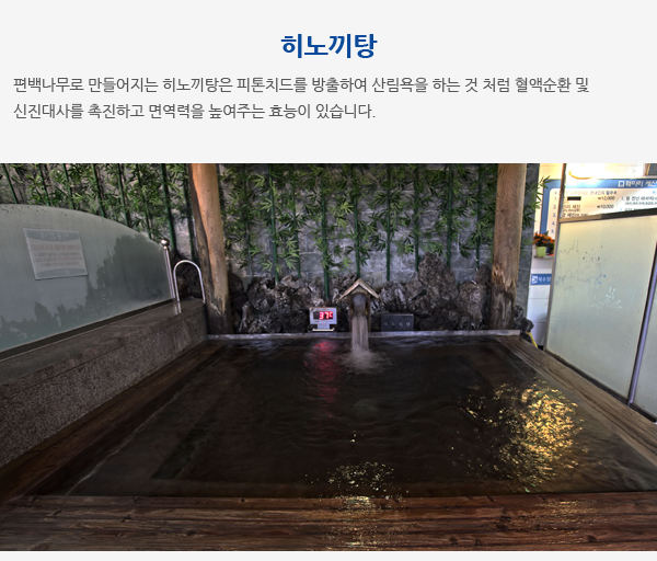 한켠에 히노끼탕도 하나 있습니다. 히노끼탕은 37도정도로 미지근한편이였습니다. 이끼청소가 잘 안돼있는지 탕은 좀 미끄러웠습니다.