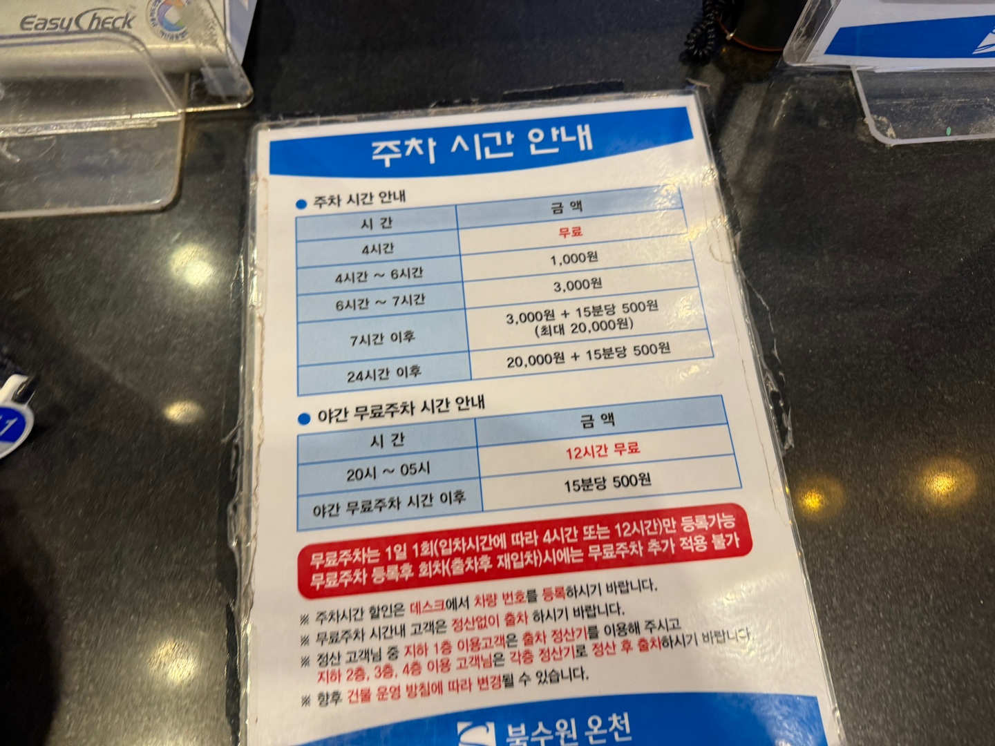 북수원온천의 주차는 주간 4시간 무료이고 20시~05시는 12시간동안 무료입니다.
