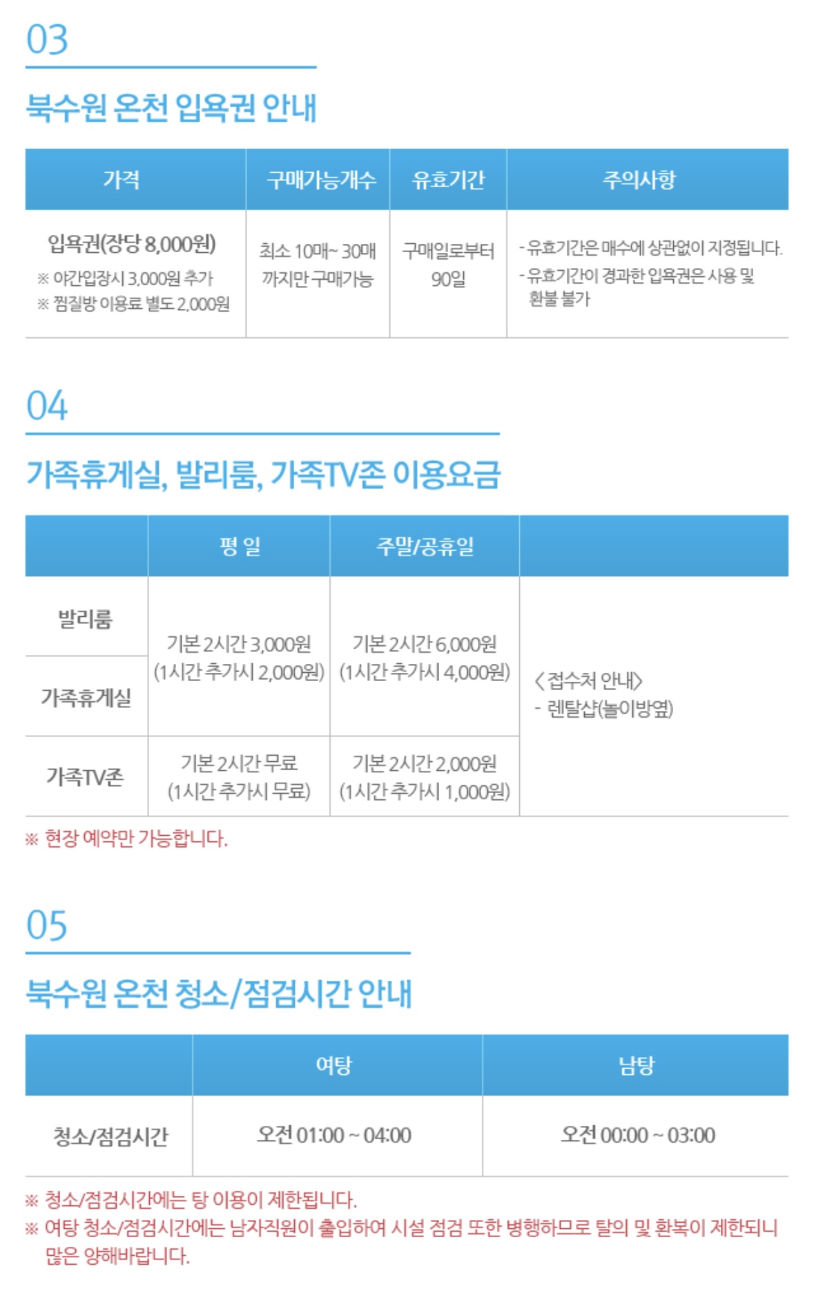 북수원온천의 청소/점검시간은 여탕은 오전1시부터 4시, 남탕은 오전 0시부터 3시까지 각 3시간입니다.