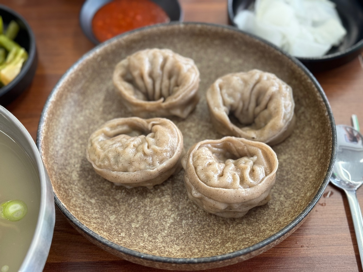 큼지막한 만두도 내용물이 알차게 들어있습니다. 만두피는 메밀가루가 들어가있는듯 합니다. 특제 양념소스에 잘 찍어서 먹었습니다.