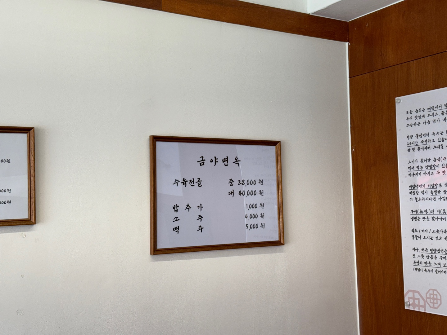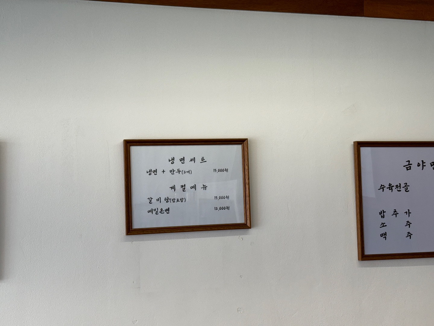 평양물냉면, 비빔냉면, 만두, 갈비탕, 메밀온면, 수육전골을 판매중입니다. 금야면옥의 수육전골은 양지, 사태가 나오는 여느 평양냉면집들과는 좀 달리 아롱사태와 갈비부위도 같이 나옵니다.