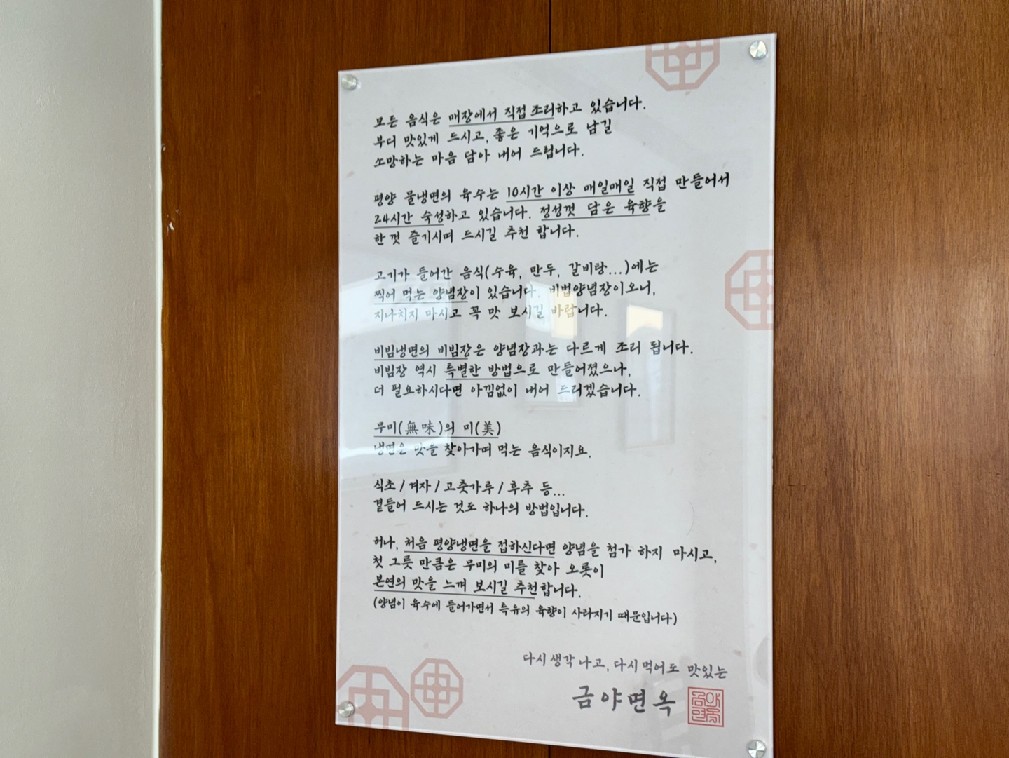 모든 음식은 매장에서 직접 조리하며 냉면 육수는 10시간 이상 직접 끓여서 24시간 숙성한다고 합니다.