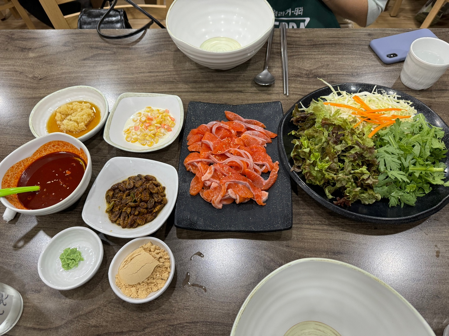 주문한지 오래 지나지 않아 맛있는 한상이 차려졌습니다. 송어회와 채소, 참기름과 마늘, 옥수수 샐러드, 번데기, 콩가루, 와사비와 직접 담근 양념장입니다. 번데기는 매콤하며 맛있었고 옥수수 샐러드도 괜찮았습니다.