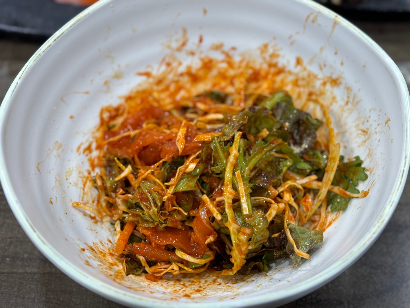 송어와 채소, 콩가루와 마늘, 참기름을 듬뿍 넣고 특제 양념장을 넣고 비벼먹었습니다.