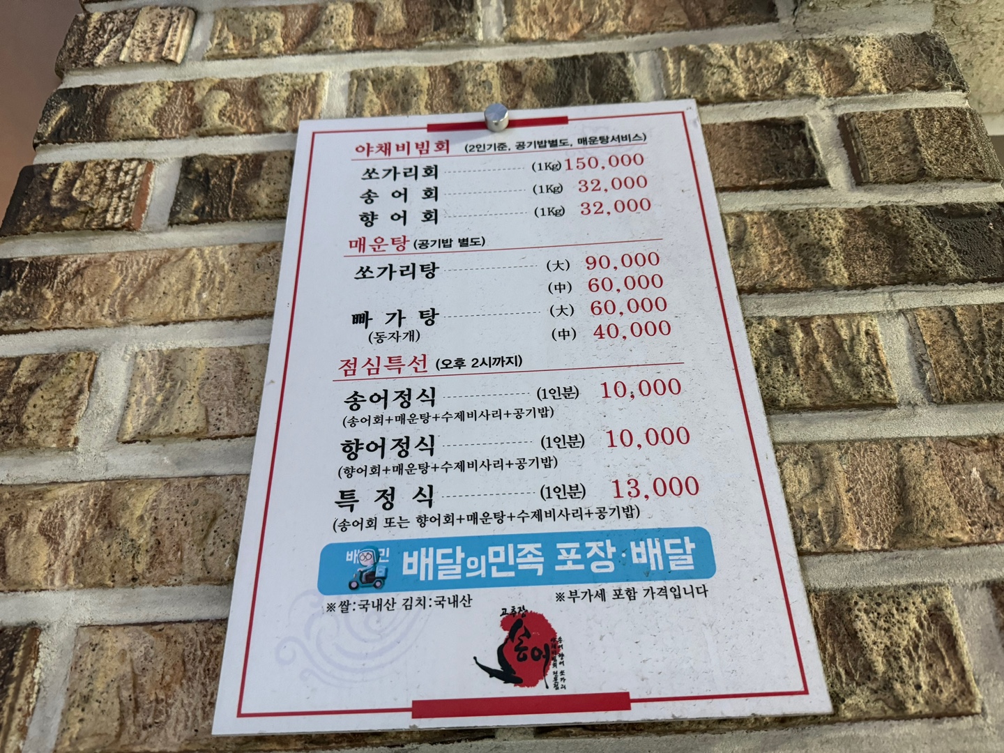 합리적인 점심특선과 야채 비빔회, 매운탕이 메인메뉴입니다. 둘이 방문해서 송어회 1kg를 주문했습니다. 야채비빔회를 주문하면 매운탕은 무료로 제공되고 공기밥은 1,000원입니다.