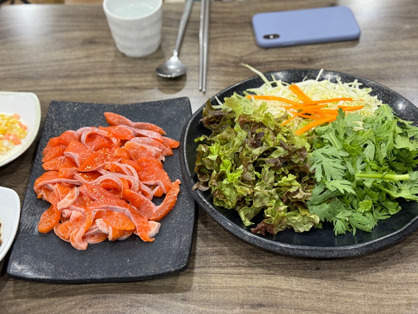 송어회는 두툼하게 먹음직스럽게 썰려나옵니다. 상추와 양배추, 쑥갓과 약간의 당근이 채소로 나옵니다.
