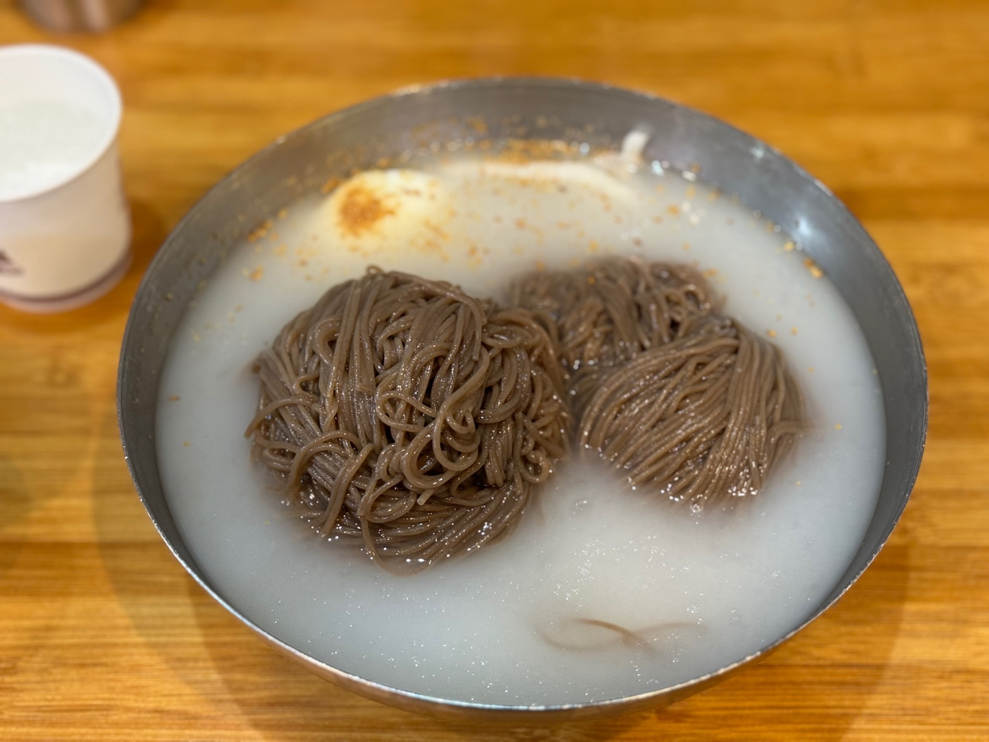 메밀면은 삶고 물기를 확실히 짜지 않아 동치미 국물이 완벽하게 배어들지 않아 살짝 아쉬웠습니다. 면 자체의 질감과 맛은 나쁘지 않았습니다.
