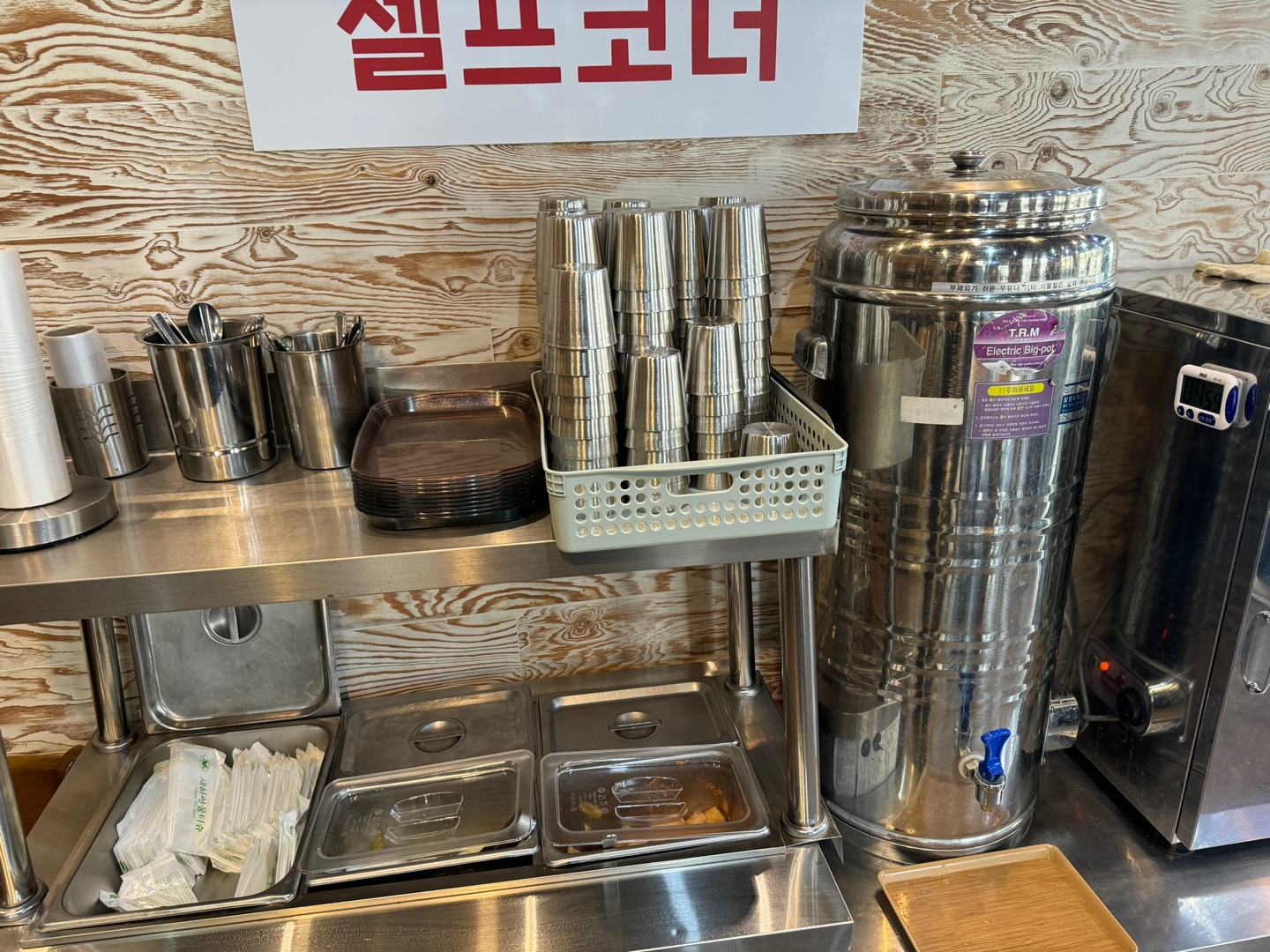 추가 반찬 및 물, 온육수는 모두 셀프입니다.